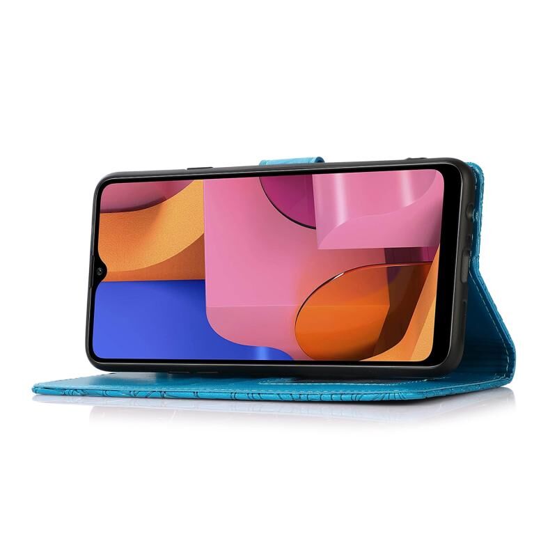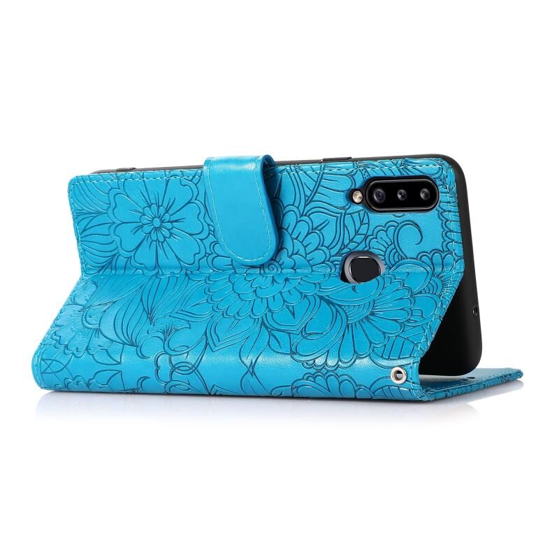 Για Samsung Galaxy A20s δέρμα αίσθηση ανάγλυφο ηλιοτρόπιο οριζόντια Flip δερμάτινη θήκη με κάτοχο & υποδοχές για κάρτες & πορτοφόλι & κορδόνι (μπλε)