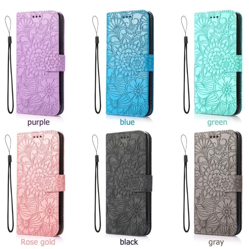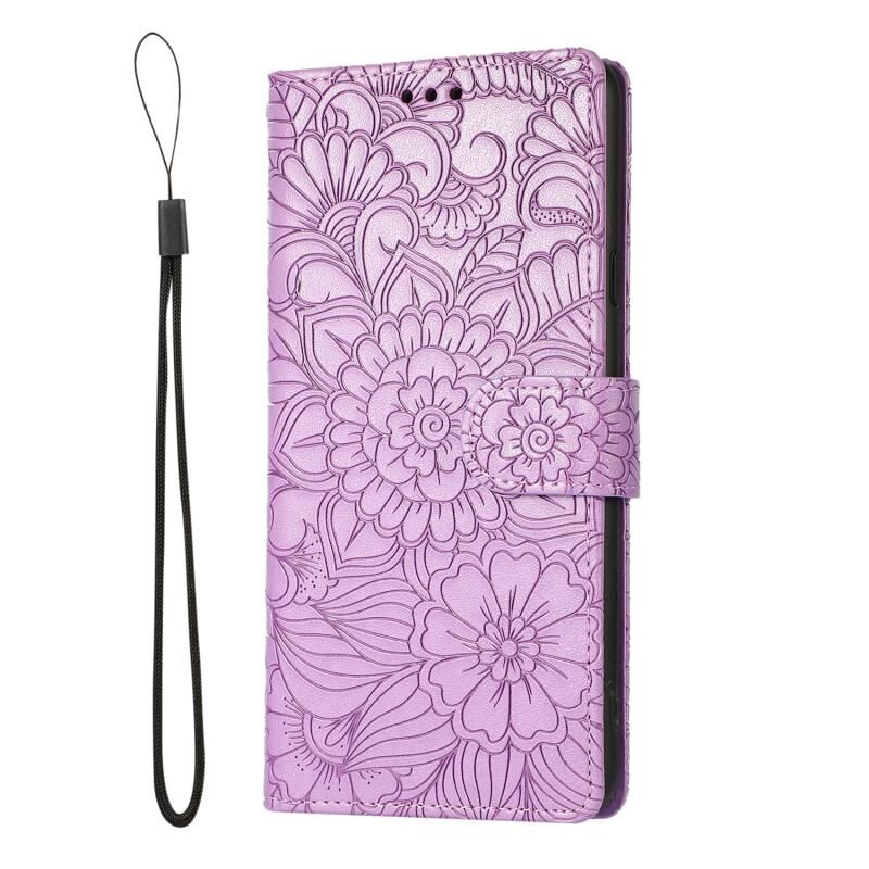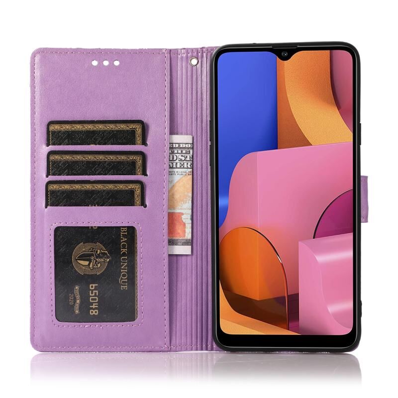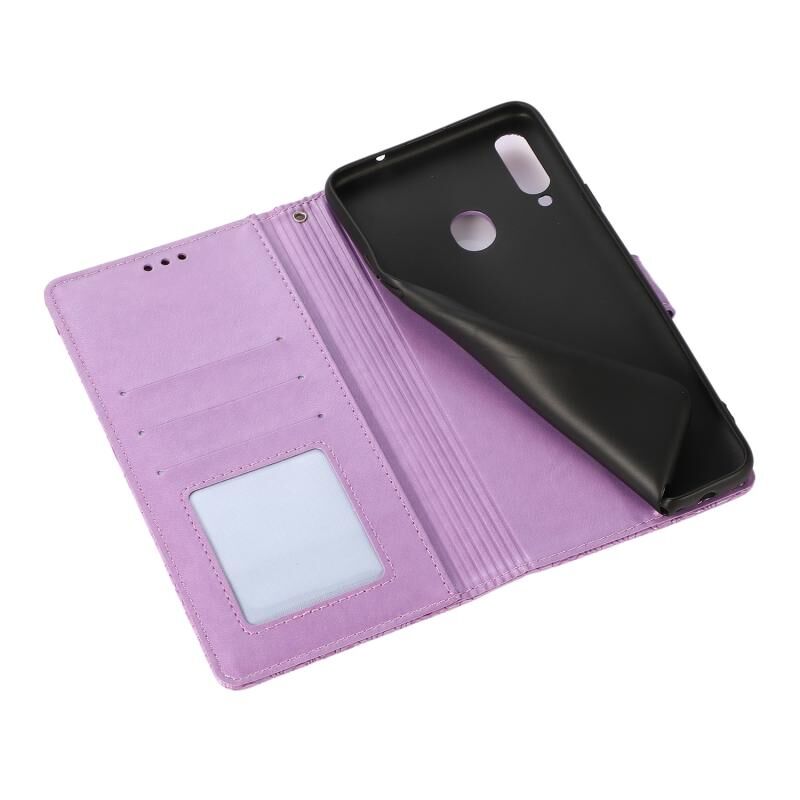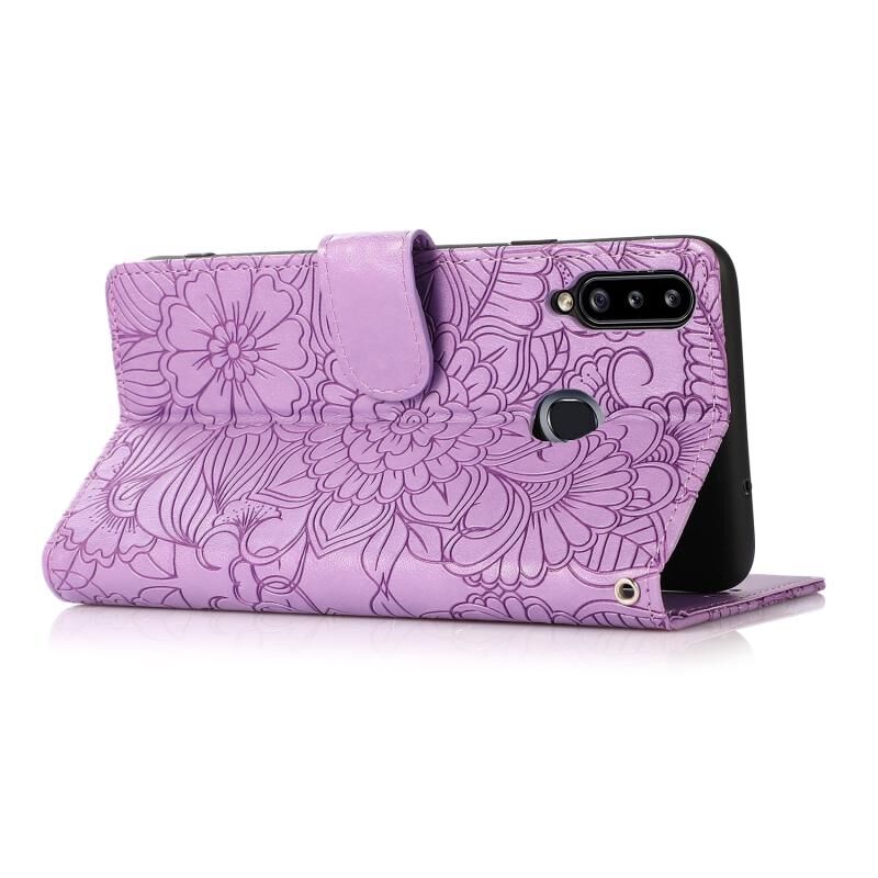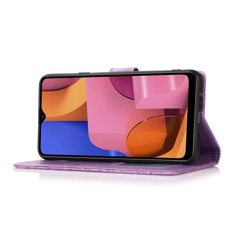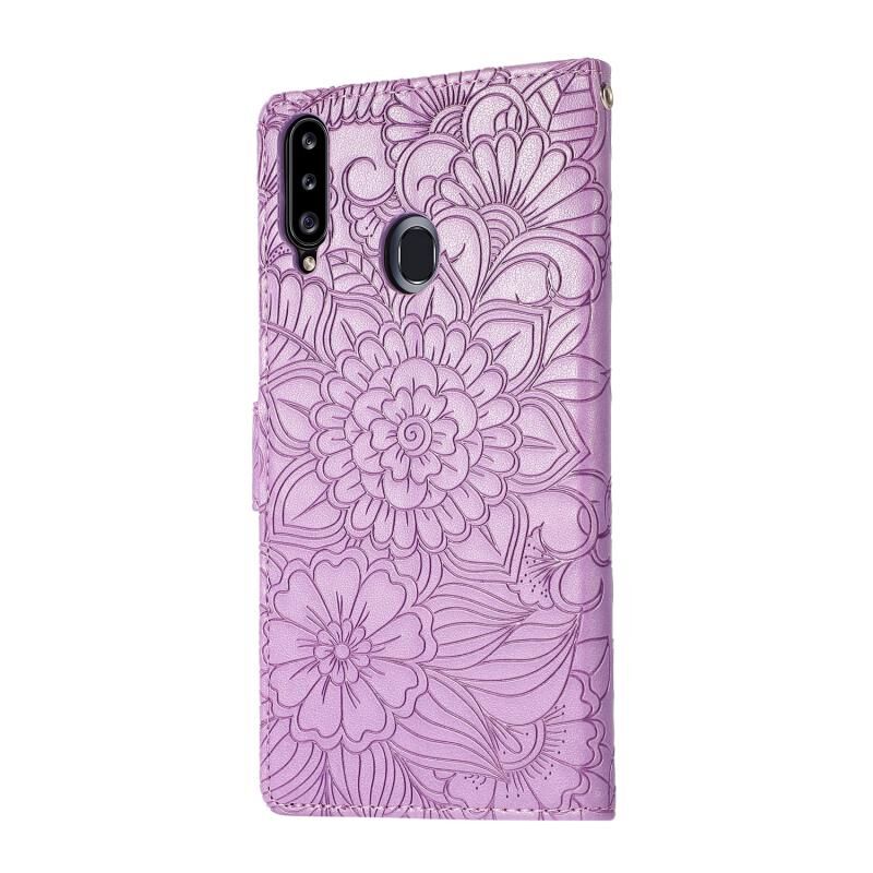 Για Samsung Galaxy A20s δέρμα αίσθηση ανάγλυφο ηλιοτρόπιο οριζόντια Flip δερμάτινη θήκη με κάτοχο & υποδοχές για κάρτες & πορτοφόλι & κορδόνι (μωβ)