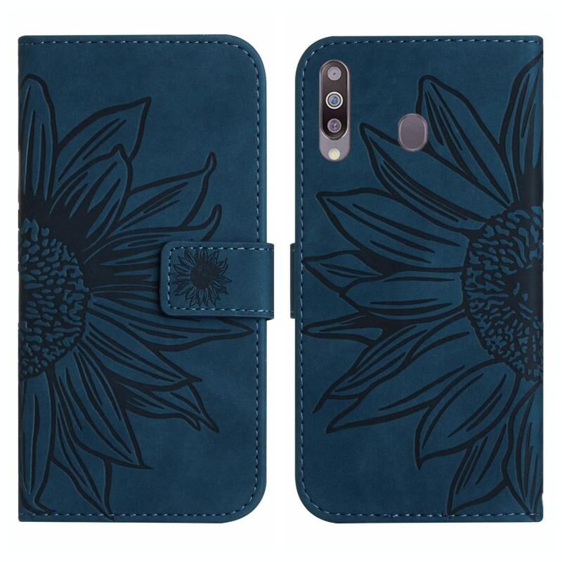 Για το Samsung Galaxy A20S δέρμα αίσθηση Sun Flower μοτίβο Flip δέρμα τηλέφωνο υπόθεση με κορδόνι (Inky Blue)