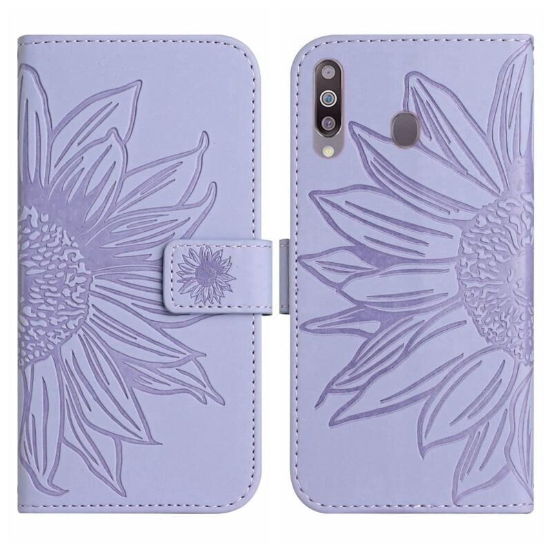 Για το Samsung Galaxy A20S δέρμα αίσθηση Sun Flower μοτίβο Flip δέρμα τηλέφωνο υπόθεση με κορδόνι (μωβ)