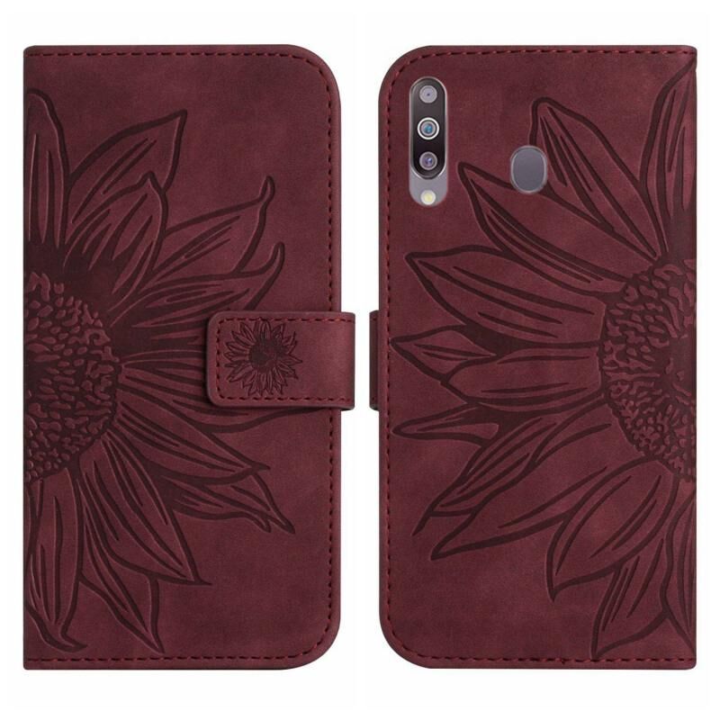 Για το Samsung Galaxy A20S δέρμα αίσθηση Sun Flower μοτίβο Flip δέρμα τηλέφωνο υπόθεση με κορδόνι (κόκκινο κρασί)