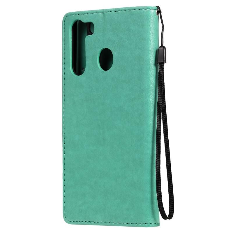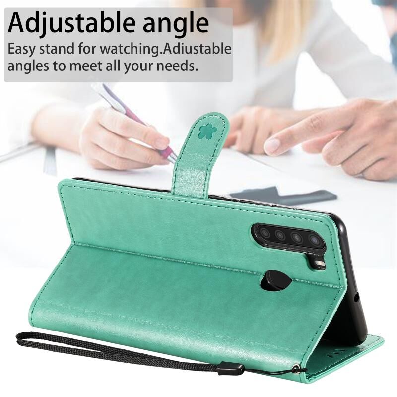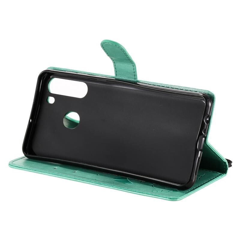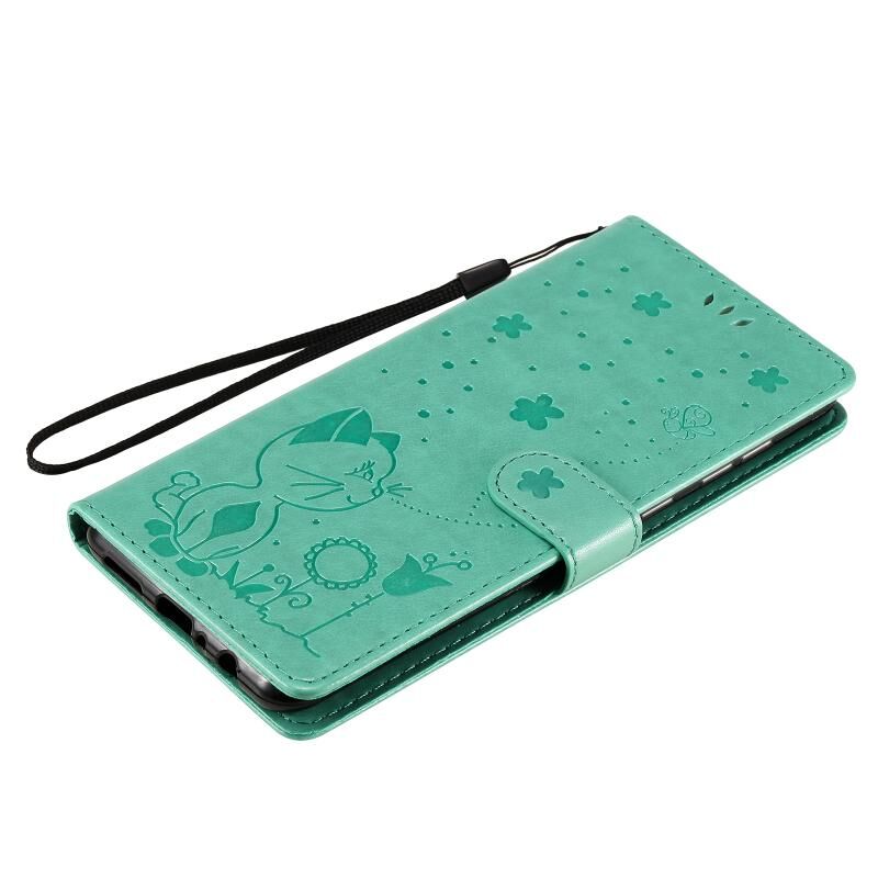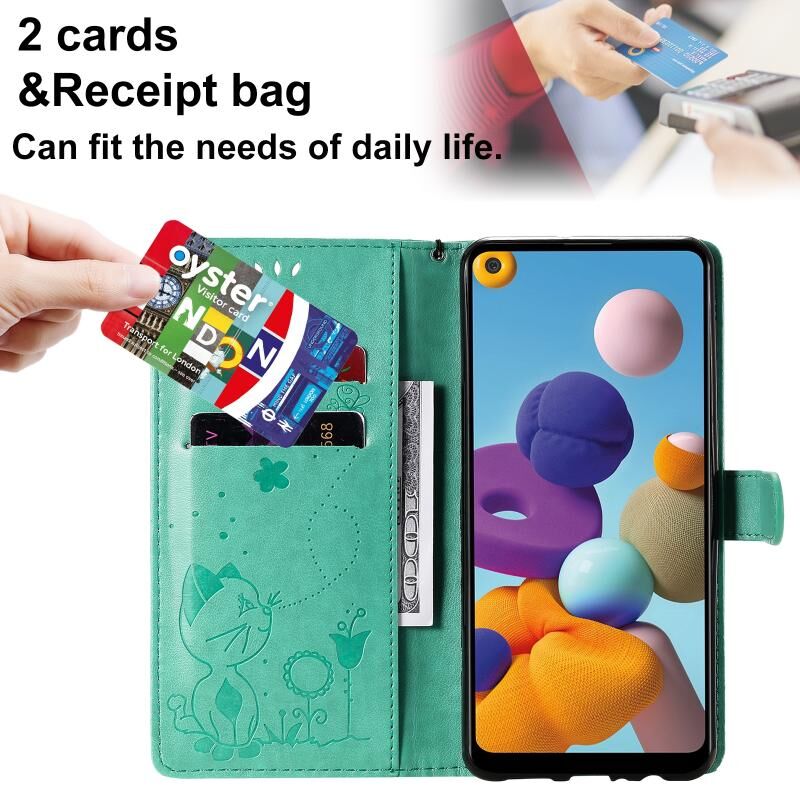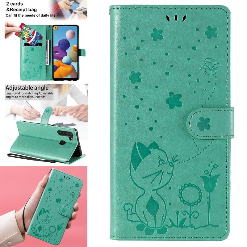 Θήκη Samsung Galaxy A21 Cat Bee με ανάγλυφο σχέδιο, αντικραδασμική, οριζόντια, από δέρμα με βάση στήριξης & θήκες καρτών & πορτοφόλι (Μπλε)