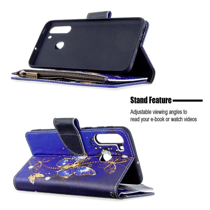 Θήκη Samsung Galaxy A21 με σχέδιο πολύχρωμης ζωγραφικής, οριζόντια, δερμάτινη με φερμουάρ, με βάση & θήκες για κάρτες & πορτοφόλι (Πεταλούδα Μωβ)