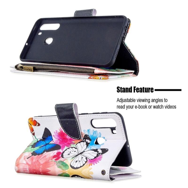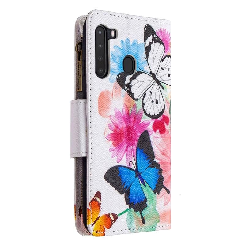 Θήκη Samsung Galaxy A21 Δερμάτινη Οριζόντια με Φερμουάρ, Πολύχρωμο Σχέδιο Ζωγραφικής με Θήκη & Θήκες Καρτών & Πορτοφόλι (Δύο Πεταλούδες)