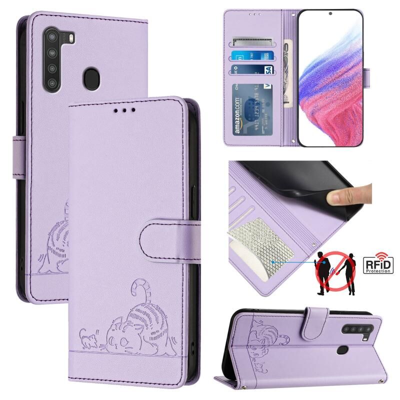 Θήκη τηλεφώνου Samsung Galaxy A21 EU Version με ανάγλυφο σχέδιο γάτας και ποντικιού, δερμάτινη με λουρί (Μέντας Πράσινο)