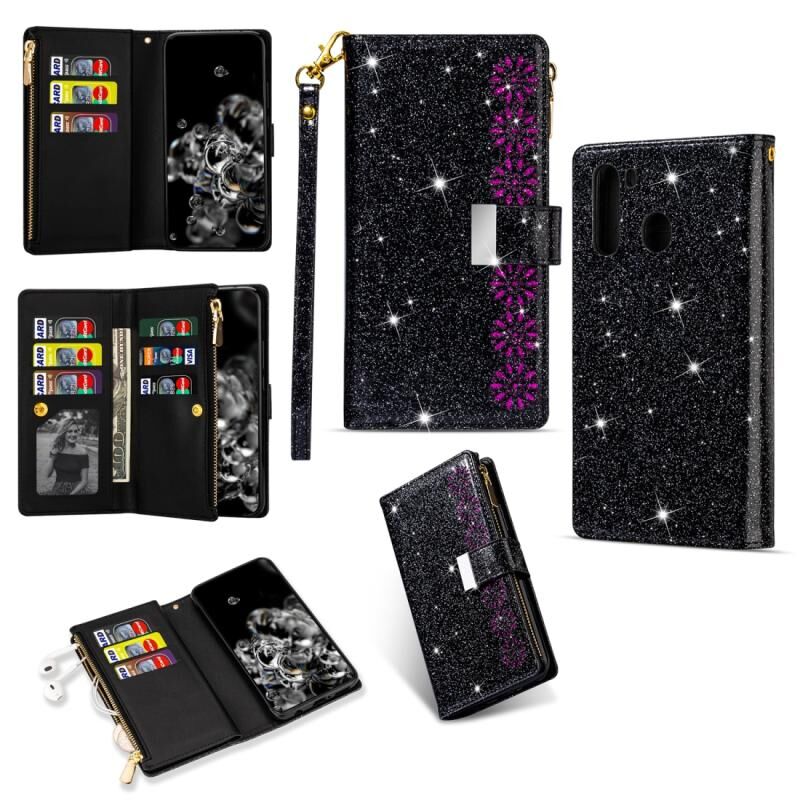 Θήκη Samsung Galaxy A21 με πολλαπλές θήκες καρτών, Laser Carving Starry Sky, Glitter, οριζόντια, δερμάτινη με βάση στήριξης, πορτοφόλι & λουρί (Μωβ)
