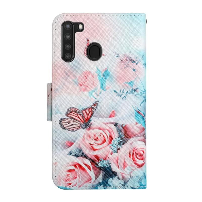 Θήκη Samsung Galaxy A21 από Δέρμα με Οριζόντιο Άνοιγμα, Βαμμένο Μοτίβο, με Θήκη & Υποδοχή Κάρτας & Πορτοφόλι (Παιώνια Πεταλούδα)