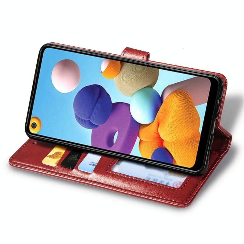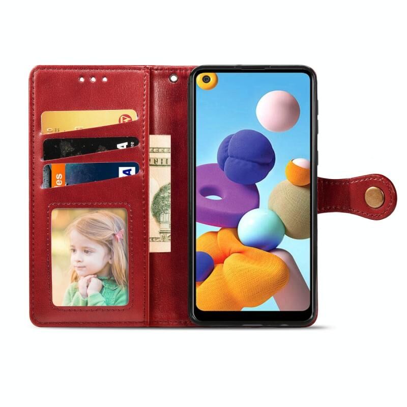 Για το Samsung Galaxy A21 U.S. Edition Retro Solid Color Δερμάτινη θήκη τηλεφώνου με αγκράφα και κορνίζα φωτογραφιών, υποδοχή για κάρτες, πορτοφόλι και λειτουργία βάσης (Κόκκινο)