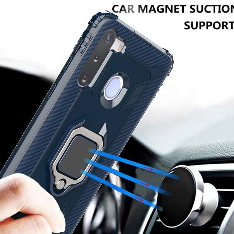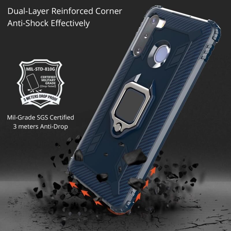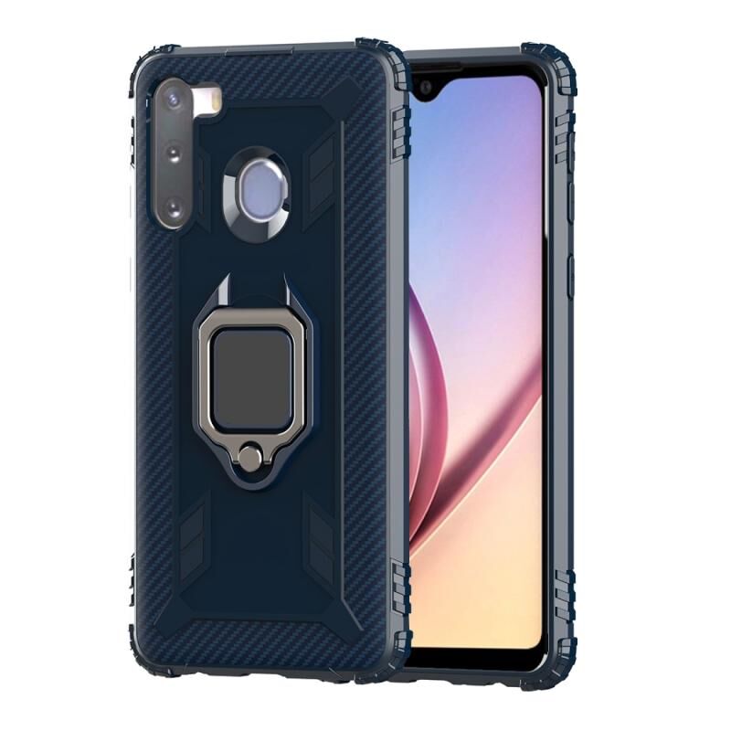 Για Samsung Galaxy A21 (US) Carbon Fiber Προστατευτική θήκη με 360 μοίρες περιστρεφόμενη θήκη δακτυλίου (μπλε)