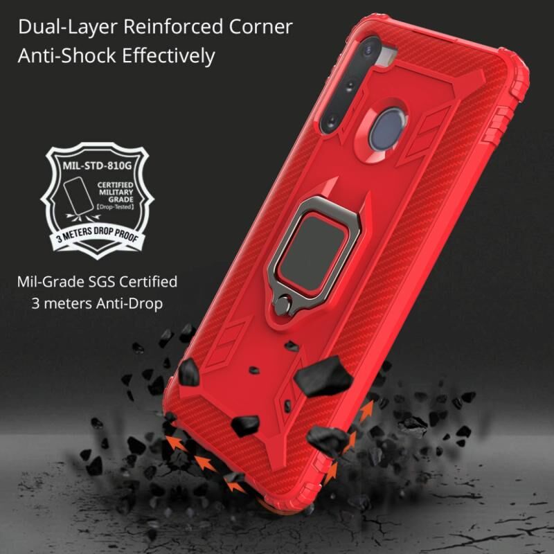 Για Samsung Galaxy A21 (US) Carbon Fiber προστατευτική θήκη με 360 μοίρες περιστρεφόμενο δαχτυλίδι κάτοχος (κόκκινο)