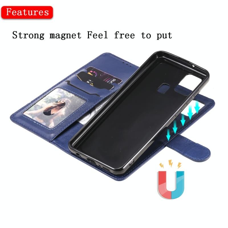 Για Samsung Galaxy A21s 2 σε 1 Αμιγές χρώμα Αποσπώμενη PU δερμάτινη θήκη με υποδοχές για κάρτες & μαγνητική θήκη & κορνίζα φωτογραφιών & πορτοφόλι & λουράκι (μπλε)