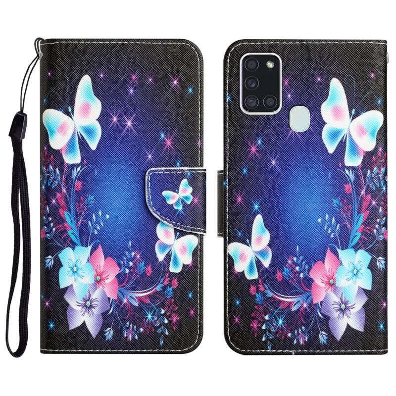 Θήκη τηλεφώνου Samsung Galaxy A21s με σχέδιο πεταλούδας από δέρμα σε διάφορα χρώματα.
