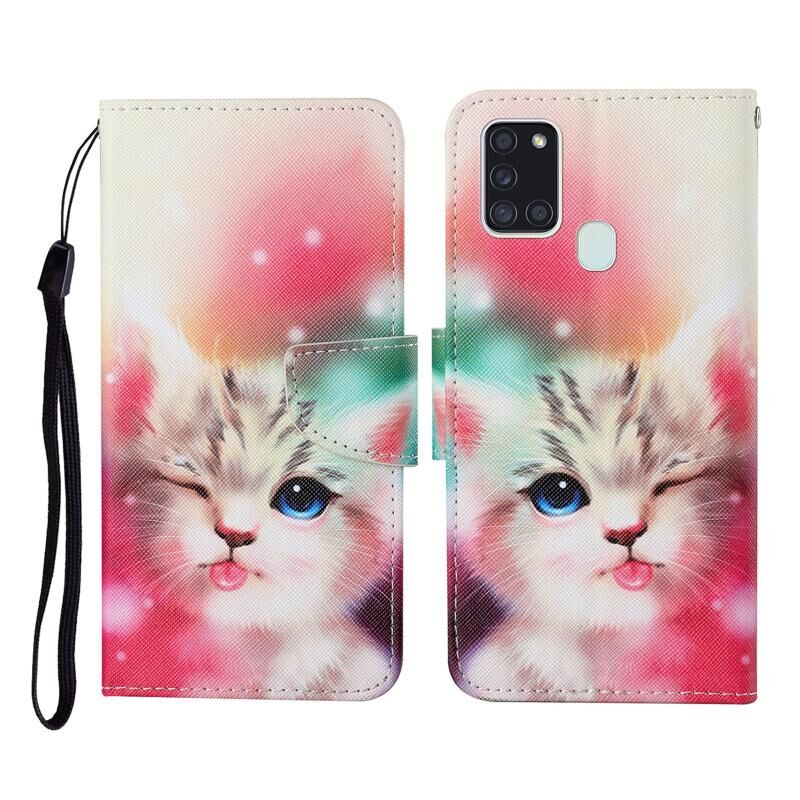Θήκη Samsung Galaxy A21s Δερμάτινη Οριζόντια με σχέδιο πολύχρωμης ζωγραφικής, με βάση, θήκες καρτών, πορτοφόλι & λουρί (Γάτα με στραβισμό)