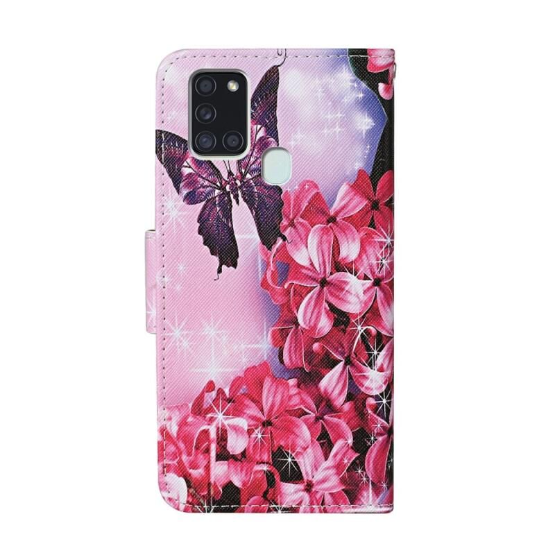Θήκη δέρματος οριζόντιας αναδίπλωσης με σχέδιο πολύχρωμης ζωγραφικής για Samsung Galaxy A21s με βάση & υποδοχές καρτών & πορτοφόλι (Μωβ Πεταλούδα)