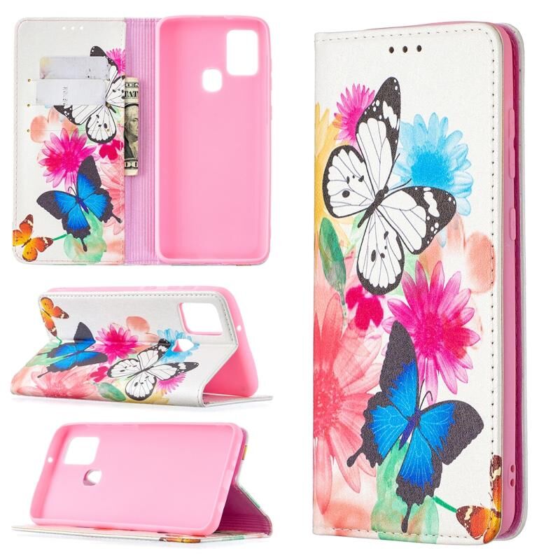 Θήκη Samsung Galaxy A21s με πολύχρωμο σχέδιο, αόρατο μαγνητικό, οριζόντιο flip από δερματίνη PU με βάση & θήκες για κάρτες & πορτοφόλι (Δύο Πεταλούδες)