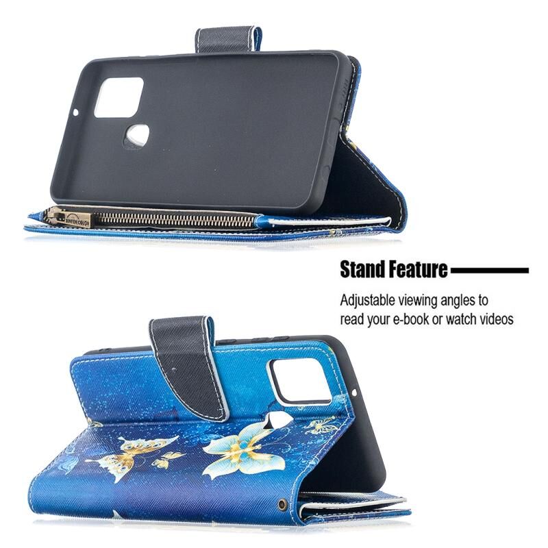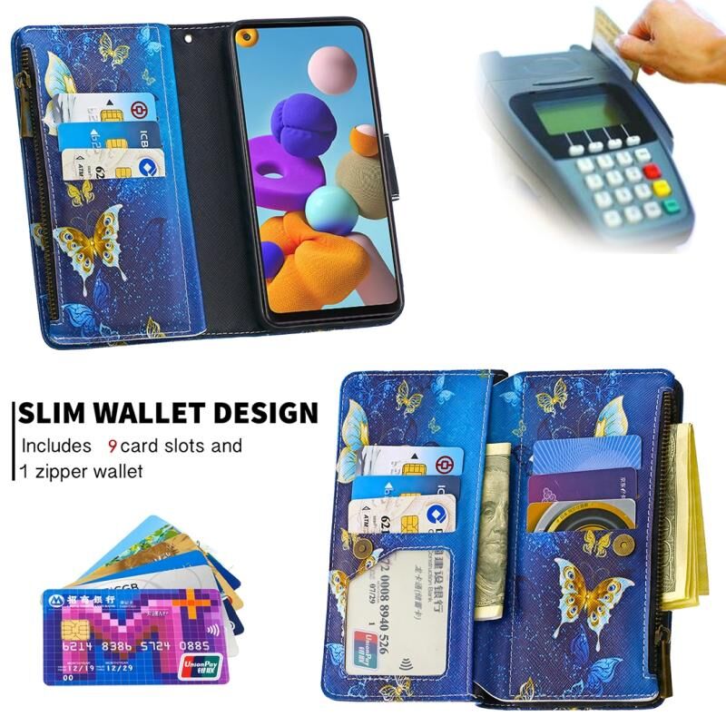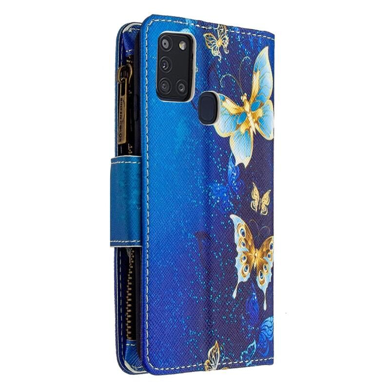 Θήκη Samsung Galaxy A21s Δερμάτινη Οριζόντια με Φερμουάρ, Πολύχρωμο Σχέδιο, με Θήκη & Θήκες Καρτών & Πορτοφόλι (Χρυσή Πεταλούδα)