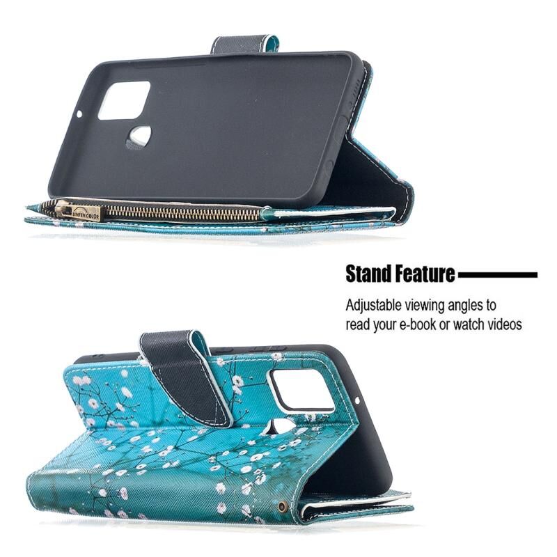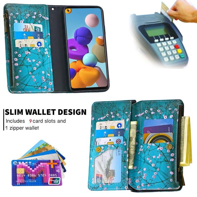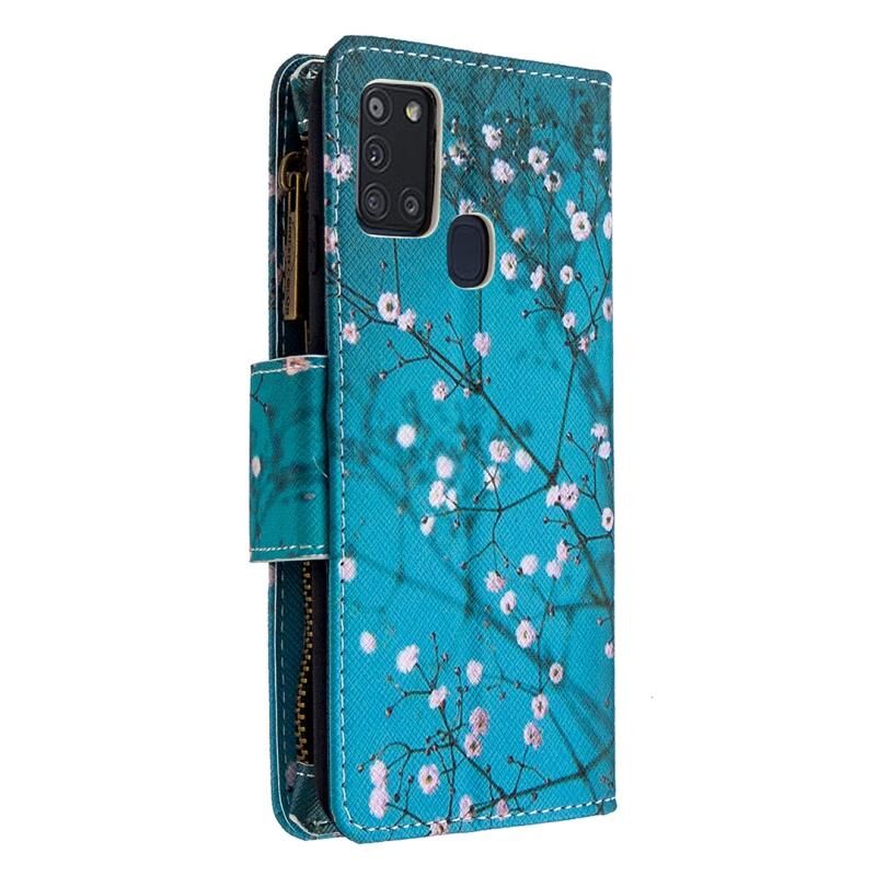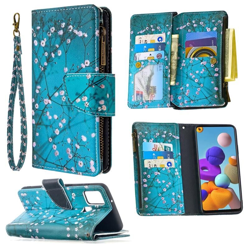 Θήκη Samsung Galaxy A21s Δερμάτινη Οριζόντια με Φερμουάρ, Πολύχρωμο Σχέδιο, με Θήκη & Θήκες Καρτών & Πορτοφόλι (Λουλούδι Δαμασκηνιάς)