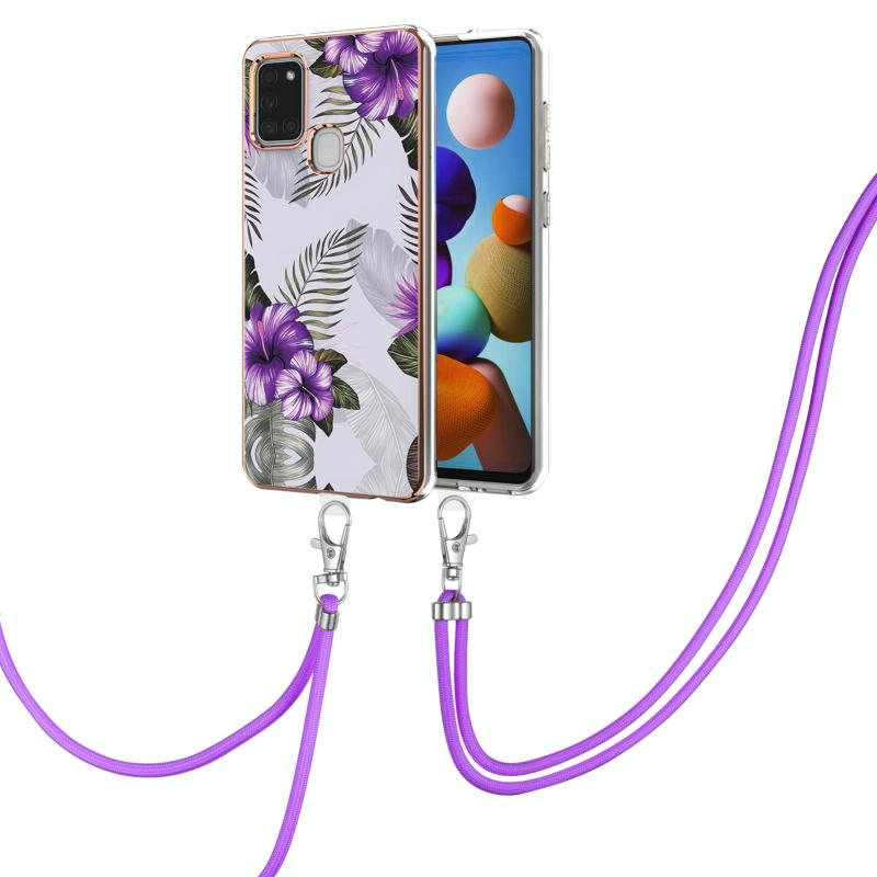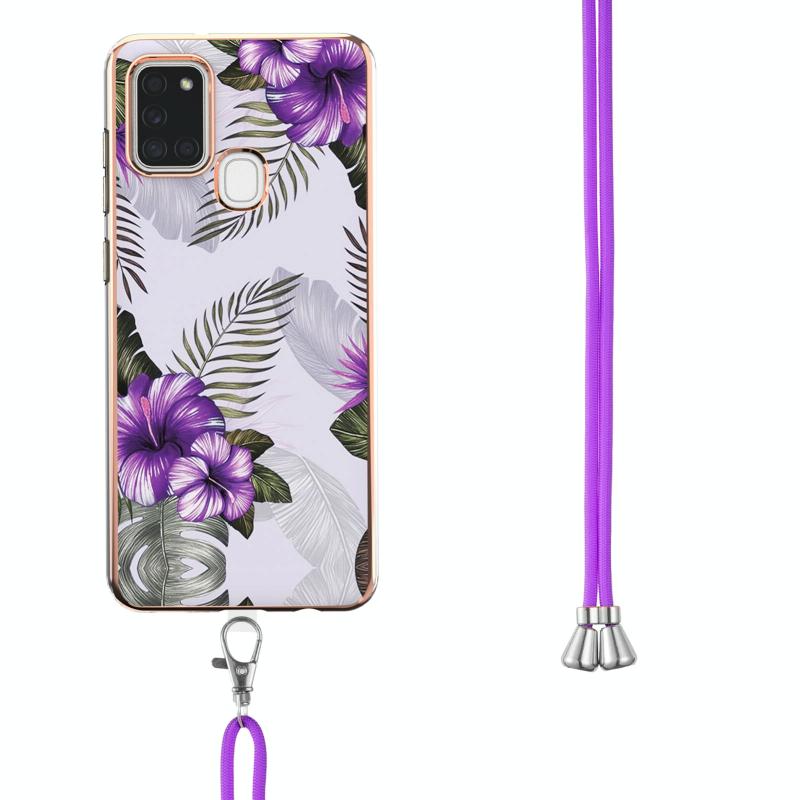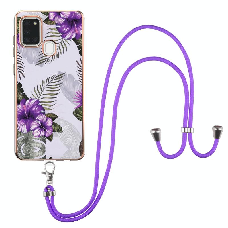 For Samsung Galaxy A21s Electroplating Pattern IMD TPU Shockproof Case with Neck Lanyard(Purple Flower)