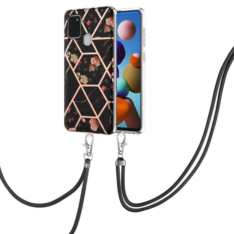 Θήκη για Samsung Galaxy A21s με ηλεκτρολυτική επιμετάλλωση, συνδυασμό μαρμάρου και λουλουδιών, από TPU με προστασία από κραδασμούς και λουρί (Ροζ Λουλούδι)