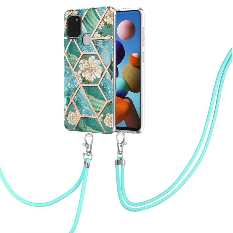 Θήκη για Samsung Galaxy A21s με ηλεκτρολυτική επιμετάλλωση, συνδυασμό μαρμάρου και λουλουδιών, από TPU με προστασία από κραδασμούς και λουρί (Ροζ Λουλούδι)