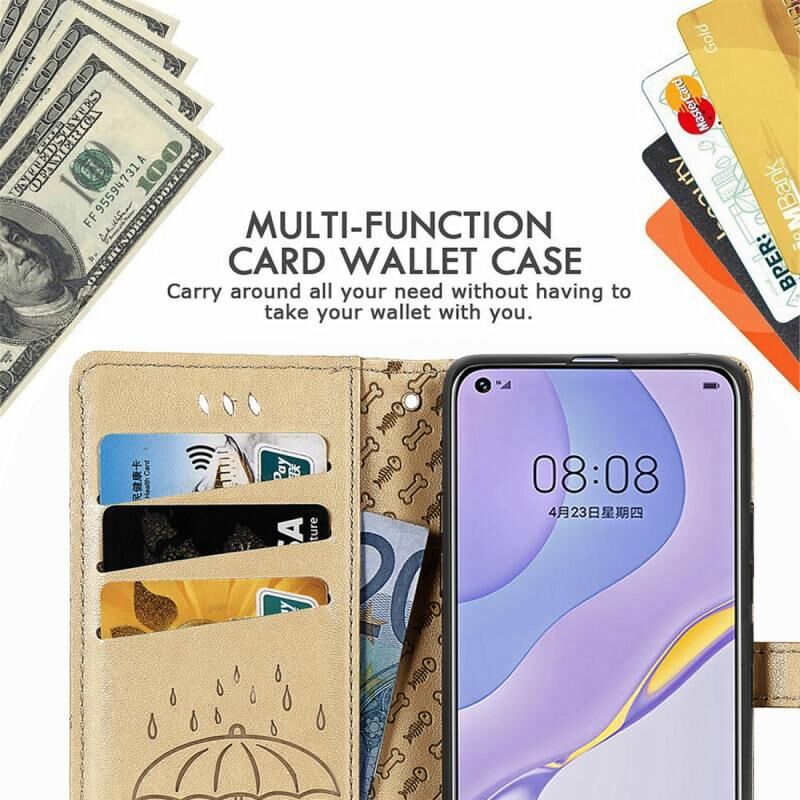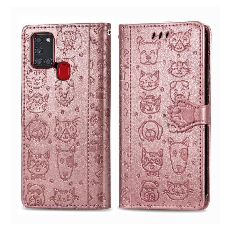 Θήκη Samsung Galaxy A21s, Δερμάτινη οριζόντια θήκη με ανάγλυφο σχέδιο χαριτωμένων γάτας και σκύλου, με βάση, θήκες για κάρτες, πορτοφόλι, κούμπωμα καρτούν και κορδόνι (Ροζ χρυσός)
