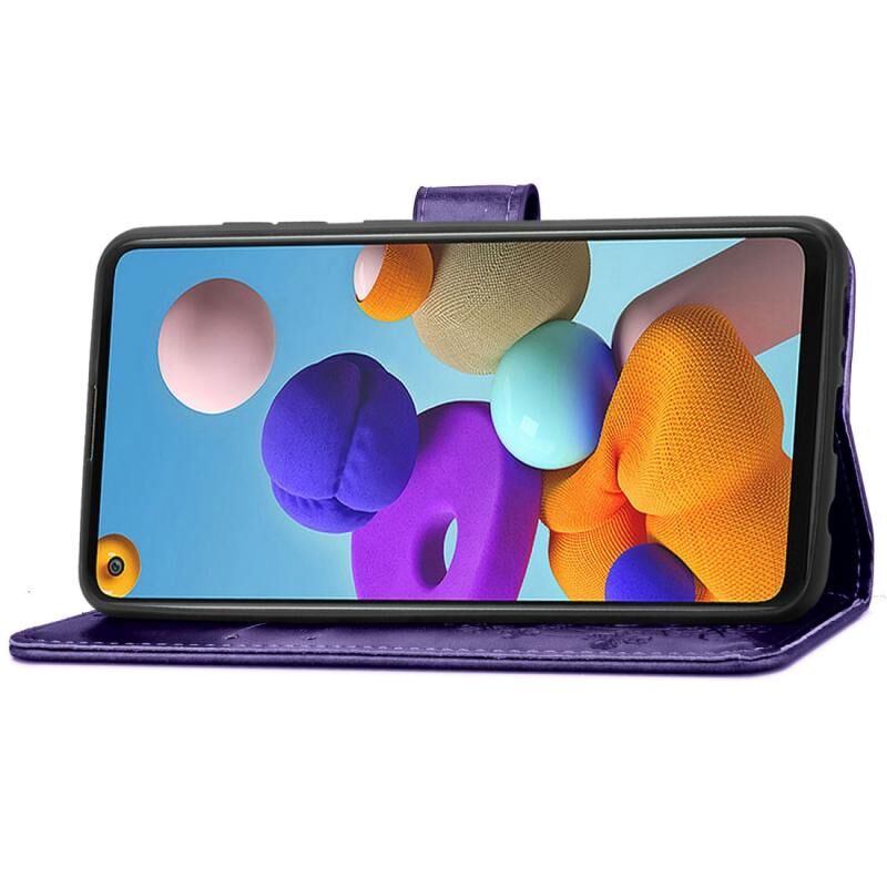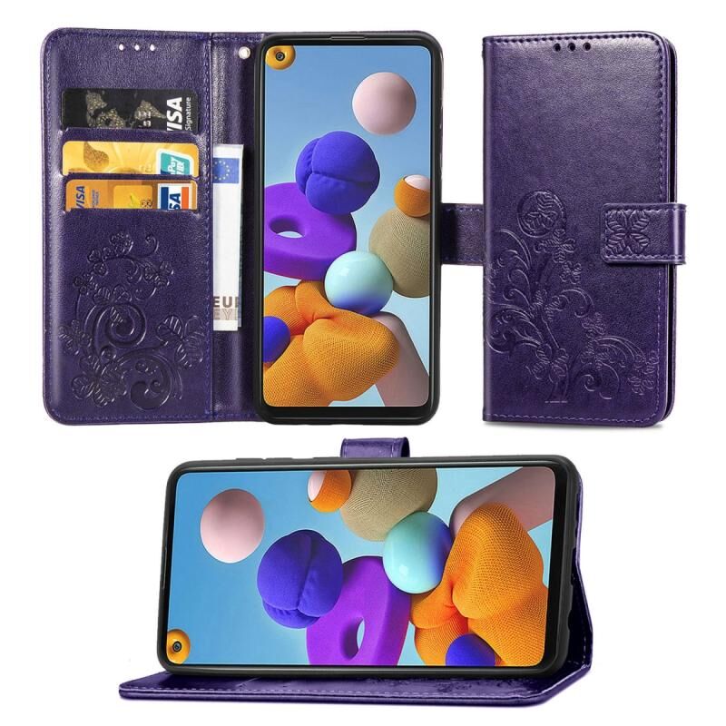 Θήκη δέρματος με σχέδιο πιεσμένων λουλουδιών Lucky Clover για Samsung Galaxy A21s με βάση στήριξης & υποδοχές καρτών & πορτοφόλι & λουρί χειρός (Μωβ)