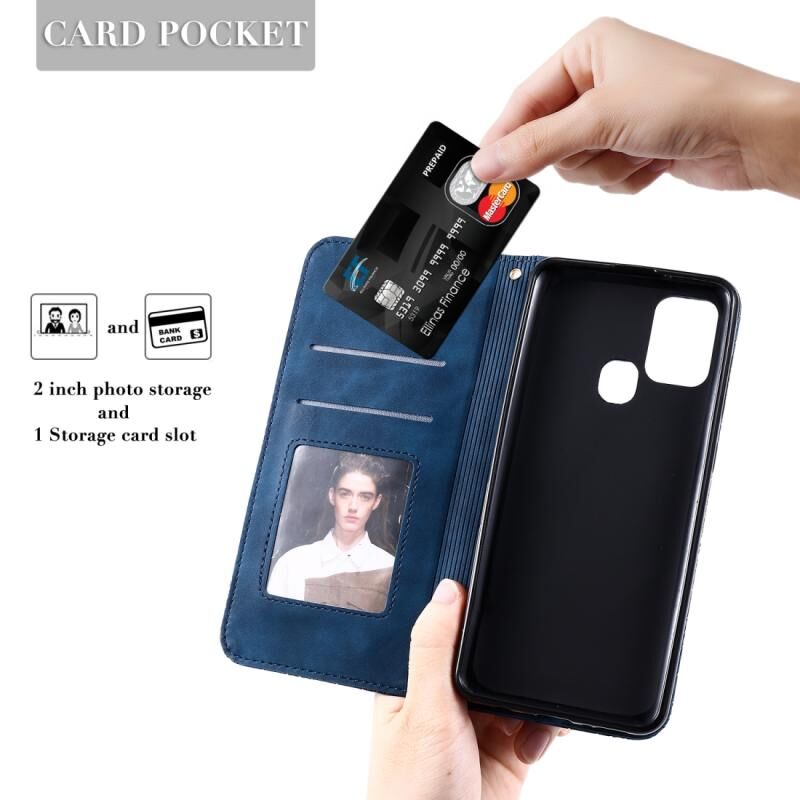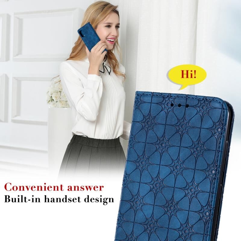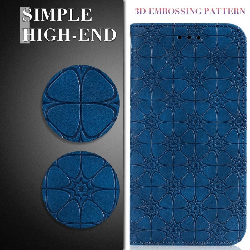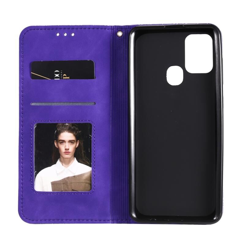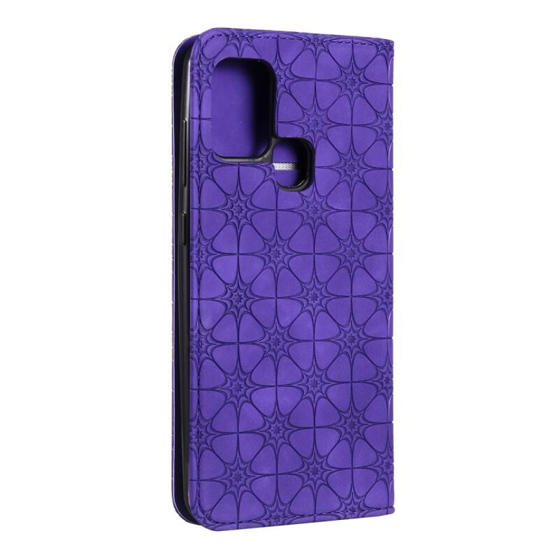 Θήκη Samsung Galaxy A21s με μαγνητικό κλείσιμο, δερμάτινη, οριζόντια, με ανάγλυφο σχέδιο λουλουδιών, βάση στήριξης & θήκες για κάρτες (Μωβ)