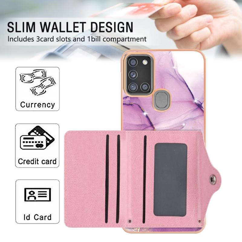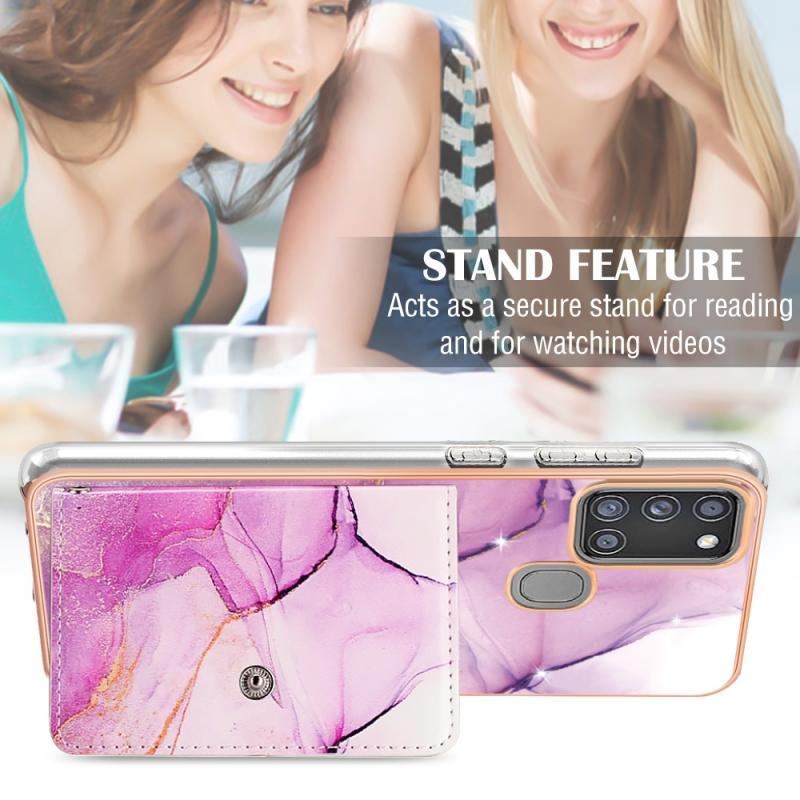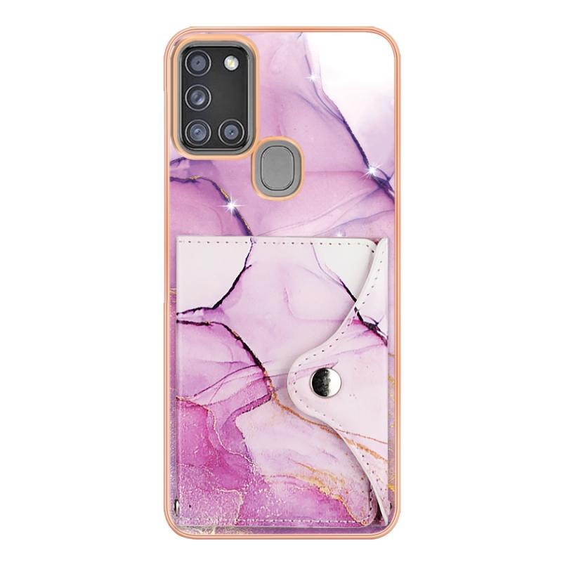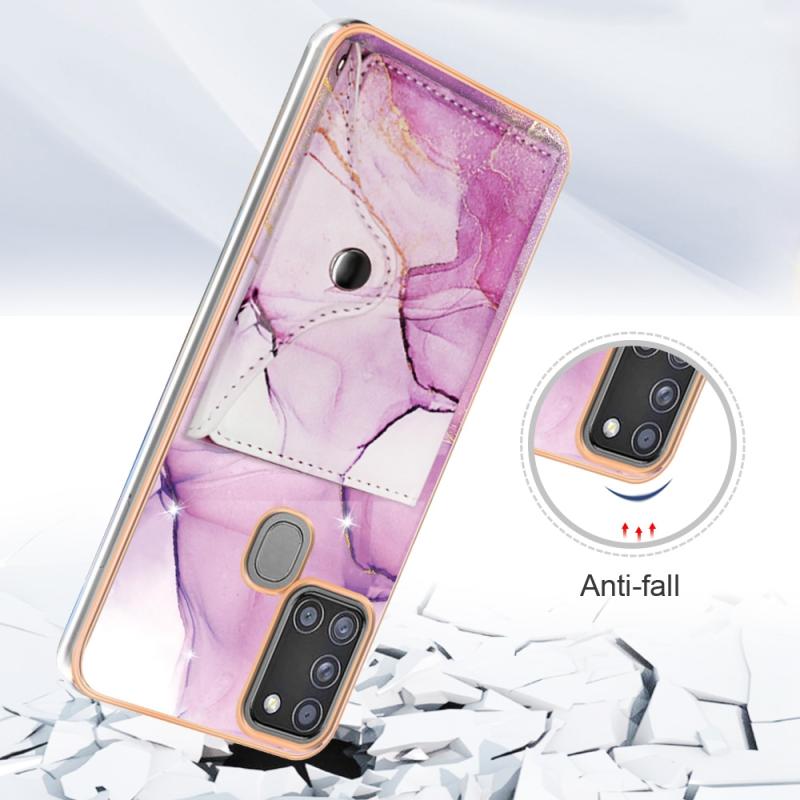For Samsung Galaxy A21s Marble Pattern IMD Card Slot Phone Case(Pink Purple Gold)