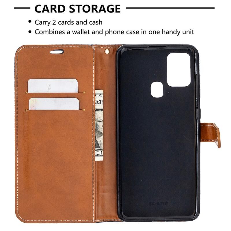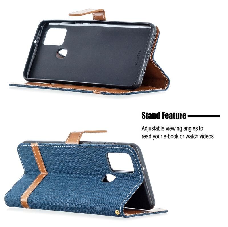 Για Samsung Galaxy A21s Matching Denim υφή οριζόντια Flip PU δέρμα υπόθεση με θήκη & υποδοχές για κάρτες & πορτοφόλι & κορδόνι (σκούρο μπλε)