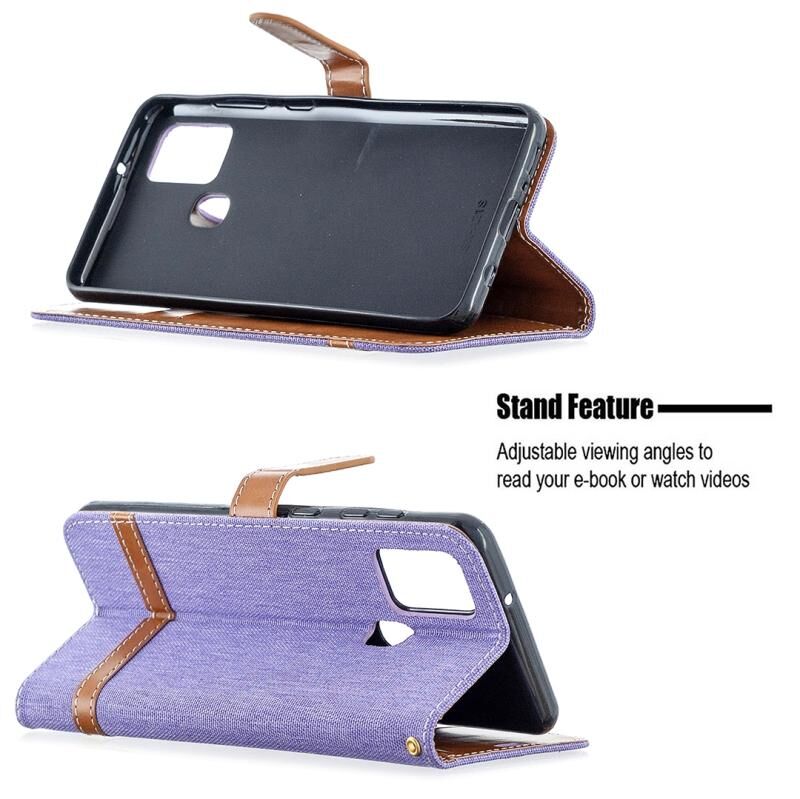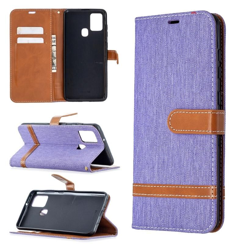 Για Samsung Galaxy A21s Matching Denim υφή οριζόντια Flip PU δέρμα υπόθεση με θήκη & υποδοχές για κάρτες & πορτοφόλι & κορδόνι (μωβ)