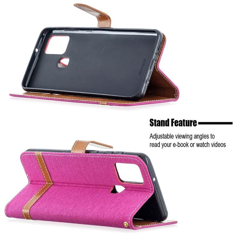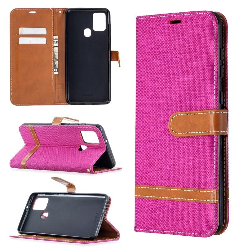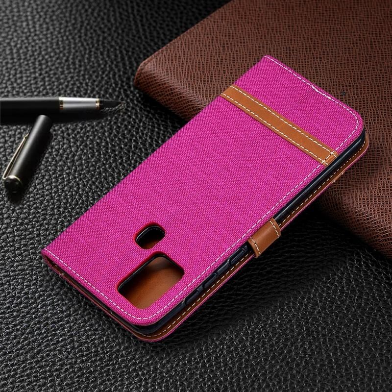 Θήκη Samsung Galaxy A21s, οριζόντια, από δερματίνη με υφή τζιν, με βάση στήριξης, θήκες για κάρτες, πορτοφόλι & λουρί (Ροζέ κόκκινο)