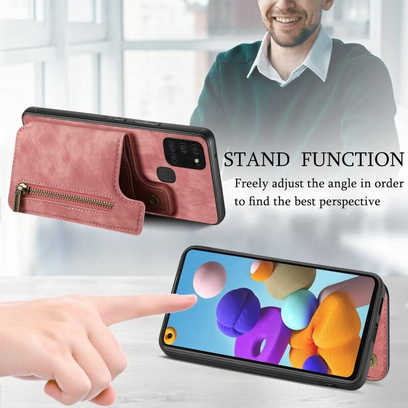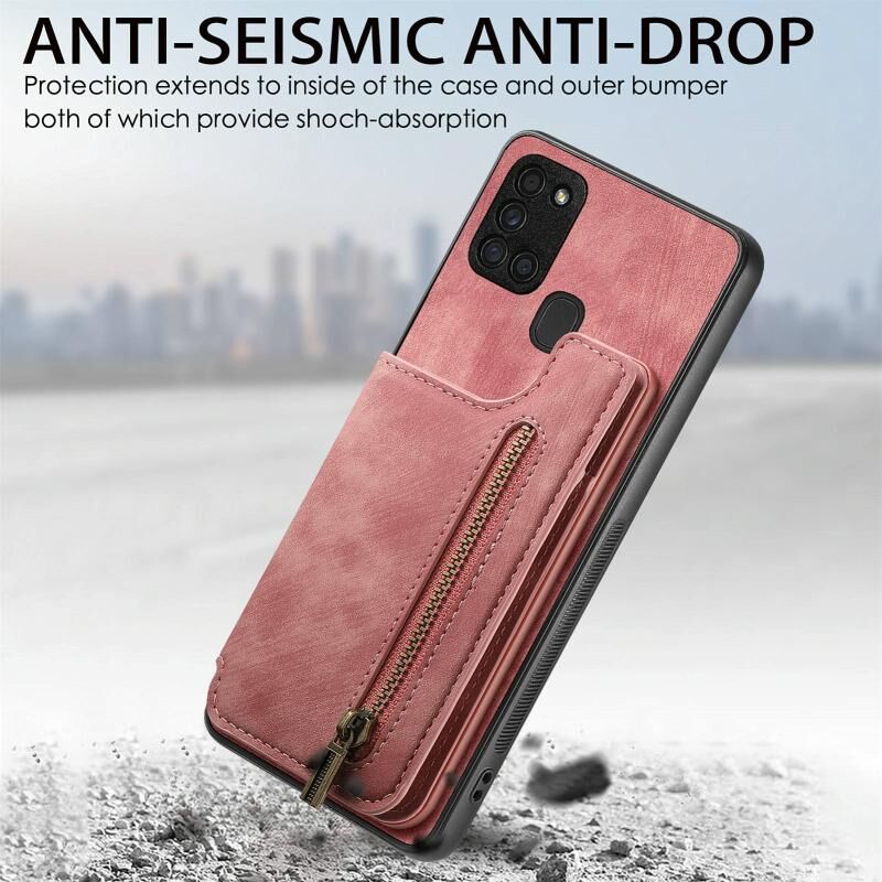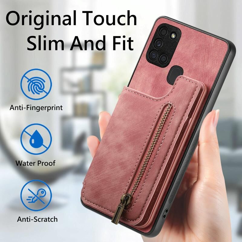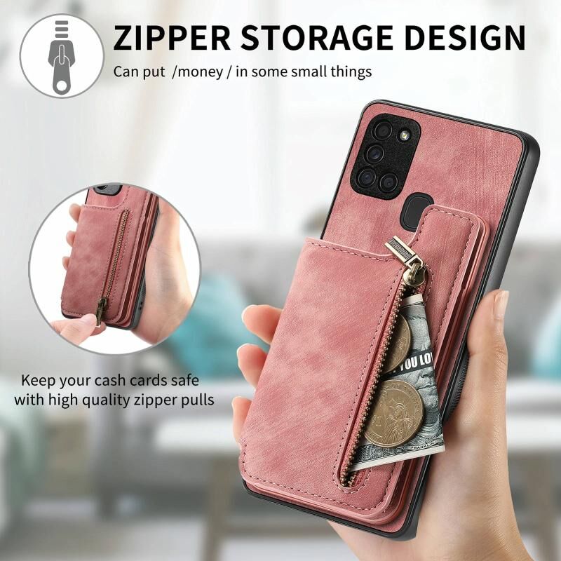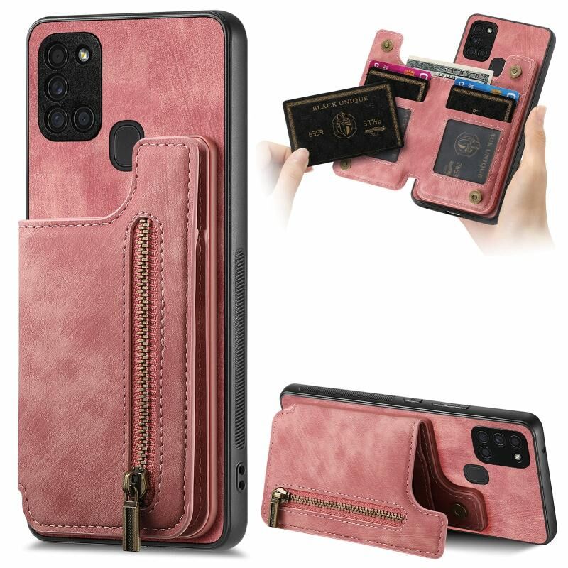 Για Samsung Galaxy A21s Ρετρό δέρμα φερμουάρ πορτοφόλι πίσω θήκη τηλεφώνου (ρόζ)