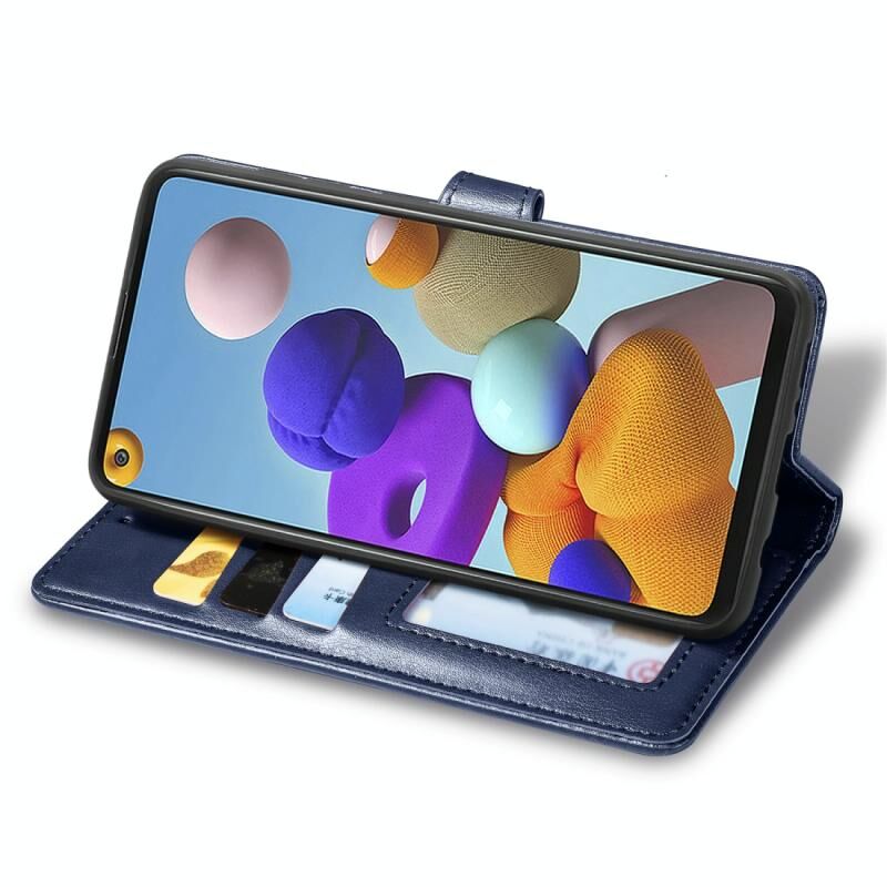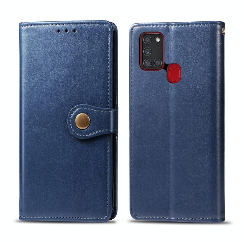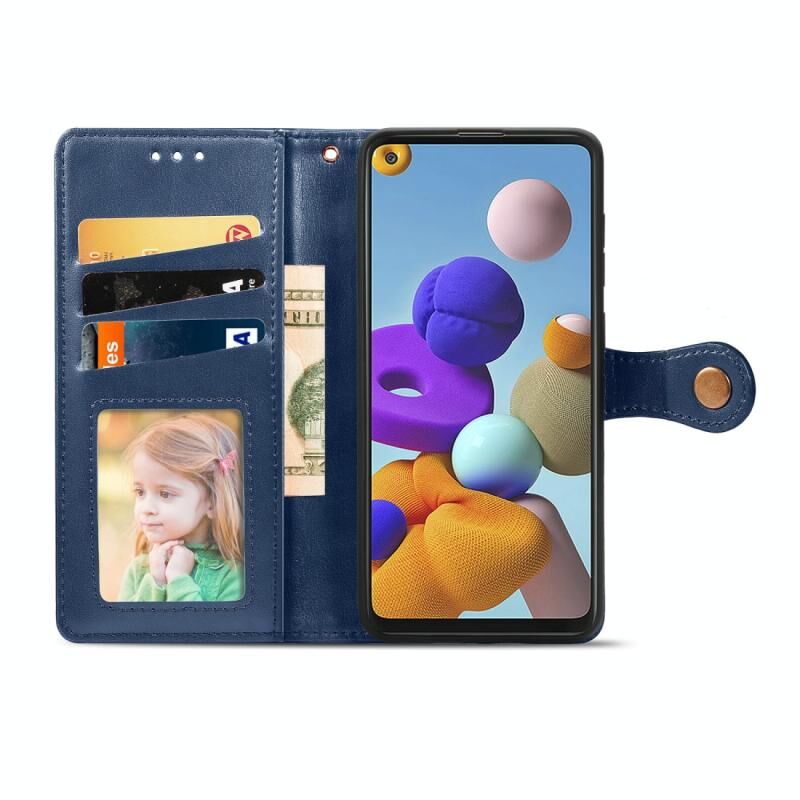 Για Samsung Galaxy A21S Ρετρό στερεό χρώμα δερμάτινη θήκη τηλεφώνου με αγκράφα και κορνίζα φωτογραφιών και υποδοχή για κάρτες και πορτοφόλι και λειτουργία στάσης (Μπλε)