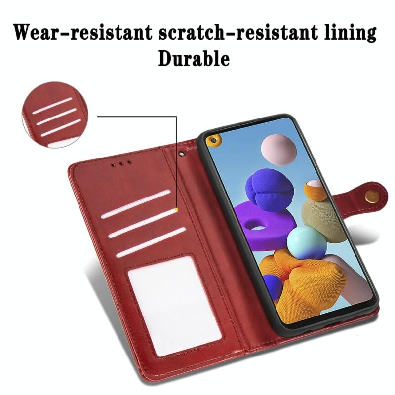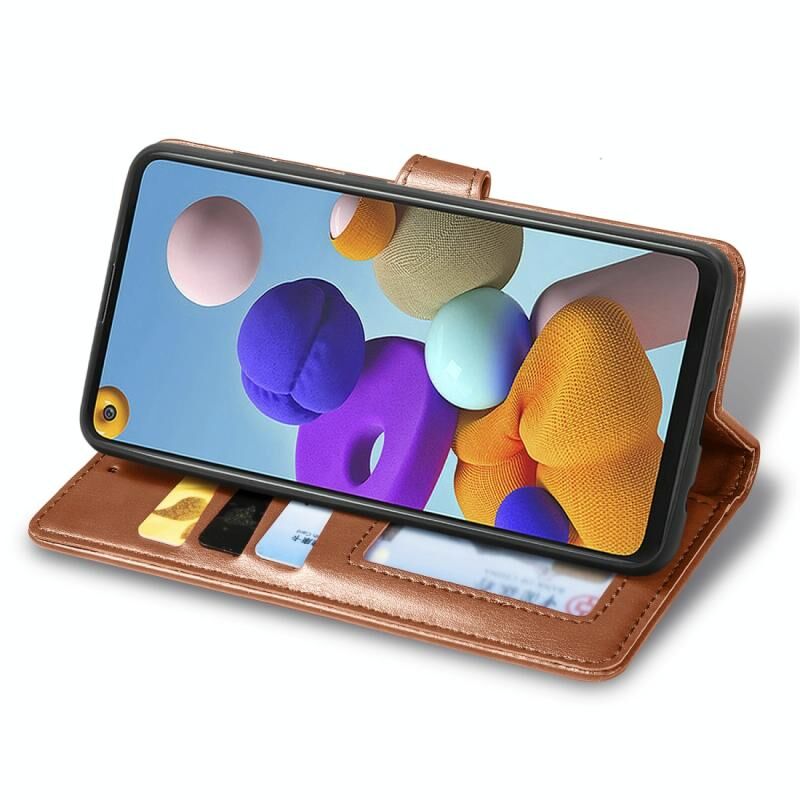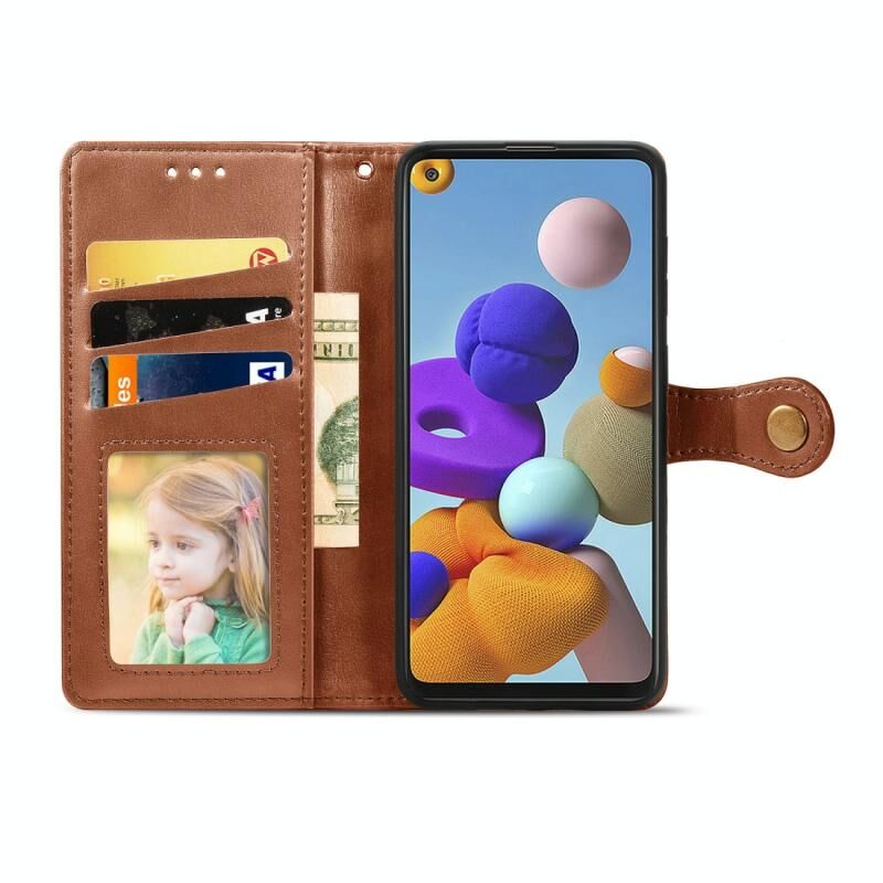 Για Samsung Galaxy A21S Ρετρό στερεό χρώμα δερμάτινη θήκη τηλεφώνου με αγκράφα και κορνίζα φωτογραφιών και υποδοχή για κάρτες και πορτοφόλι και λειτουργία στάσης (Καφέ)