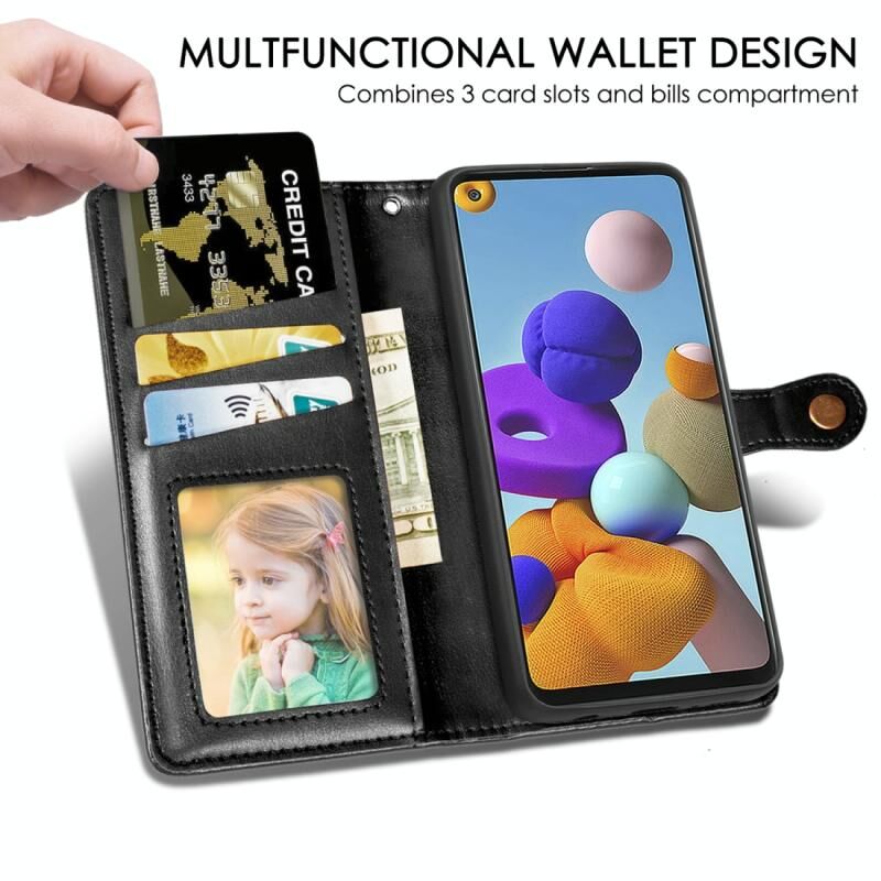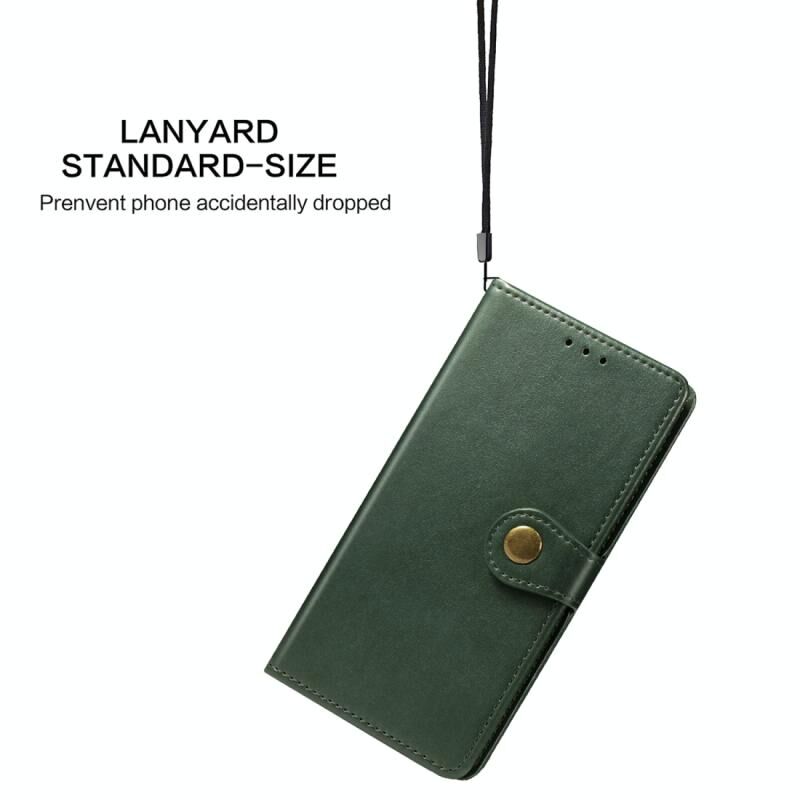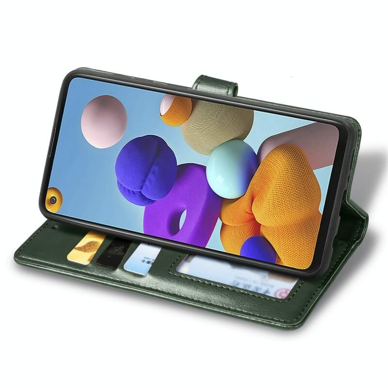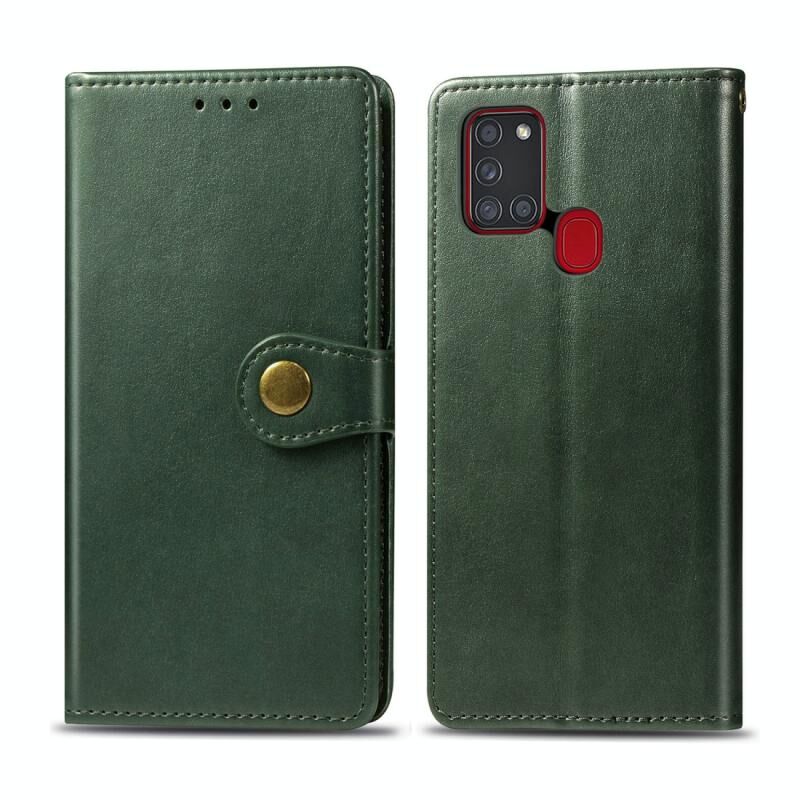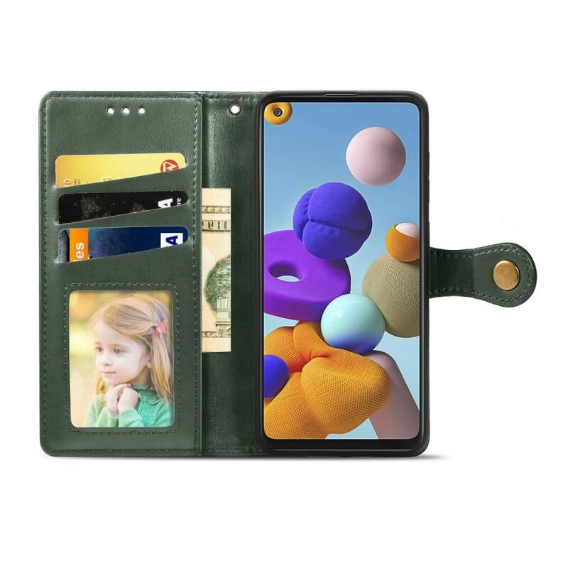 Για Samsung Galaxy A21S Ρετρό στερεό χρώμα δερμάτινη θήκη τηλεφώνου με αγκράφα και κορνίζα φωτογραφιών και υποδοχή για κάρτες και πορτοφόλι και λειτουργία στάσης (πράσινο)
