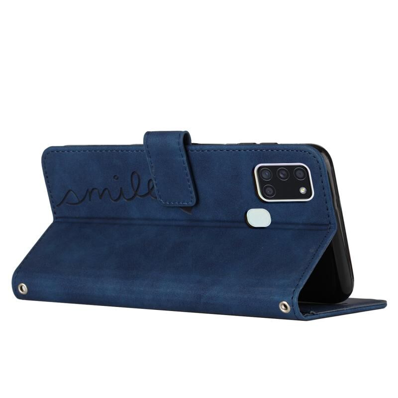 Για Samsung Galaxy A21s δέρμα αίσθηση καρδιά μοτίβο δερμάτινη θήκη τηλεφώνου με κορδόνι (Μπλε)