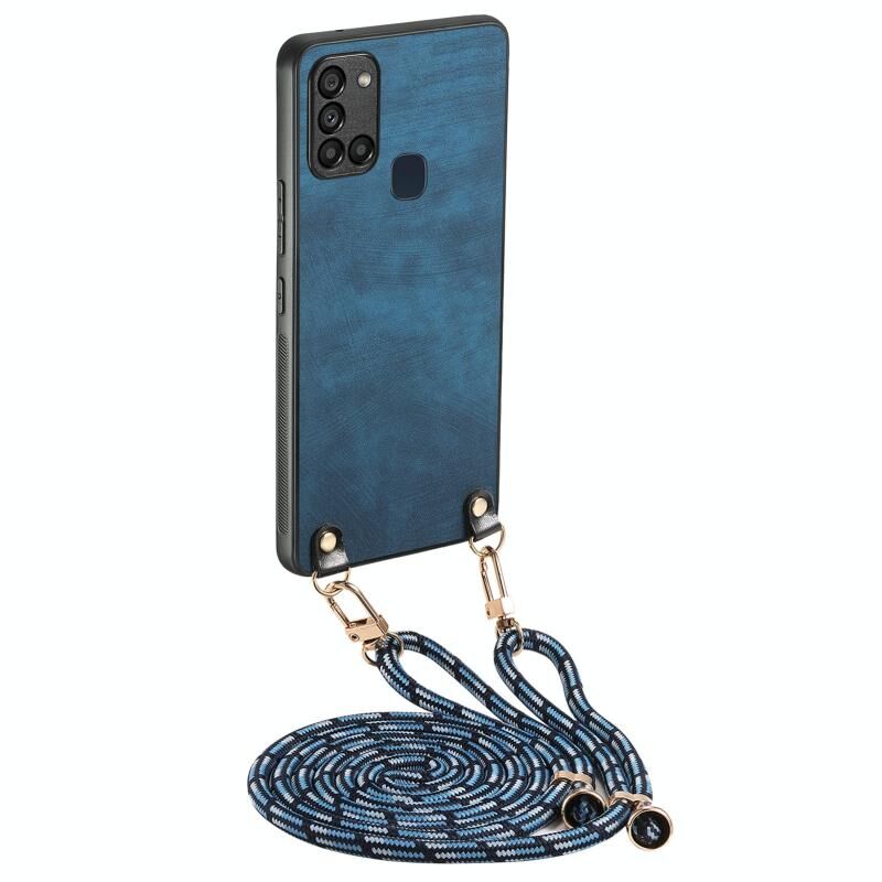 Για Samsung Galaxy A21s εκλεκτής ποιότητας δέρμα PC πίσω κάλυψη υπόθεση τηλεφώνου με λουράκι σταυρού (μπλε)