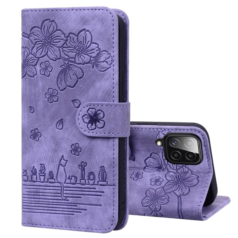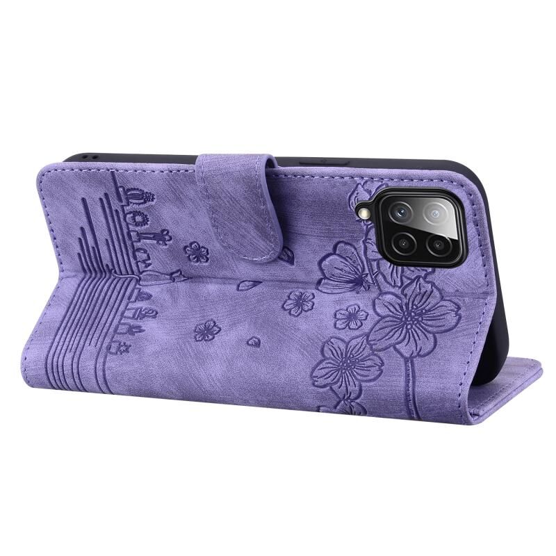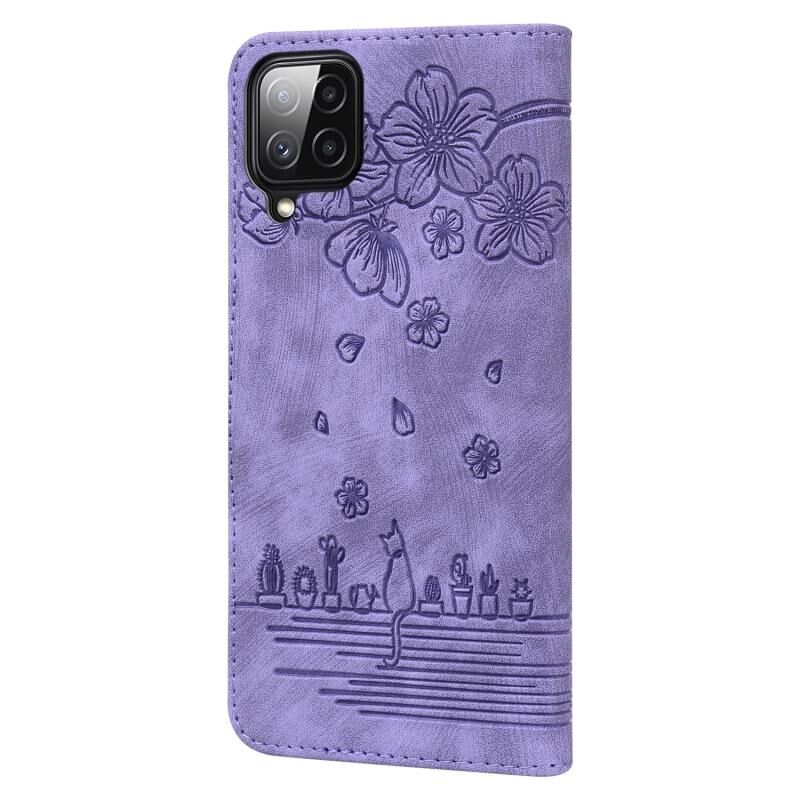 Θήκη τηλεφώνου Samsung Galaxy A22 4G, σχέδιο καρτούν Sakura Cat, ανάγλυφο δέρμα (Βασιλικό Μπλε)