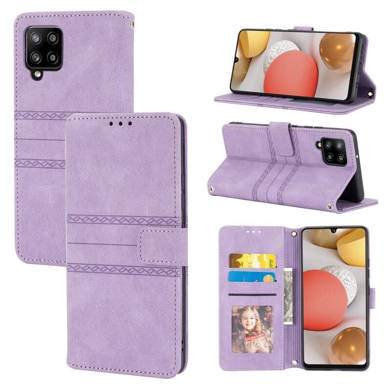 Για Samsung Galaxy A22 4G ανάγλυφη ριγέ μαγνητική πόρπη PU + TPU οριζόντια Flip δερμάτινη θήκη με θήκη & υποδοχή κάρτας & πορτοφόλι & κορνίζα φωτογραφιών & σφεντόνα (μωβ)