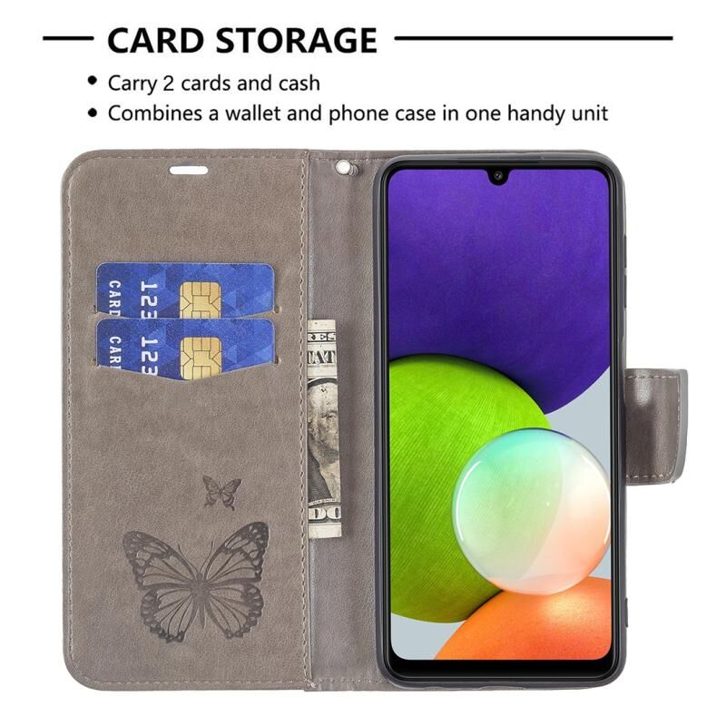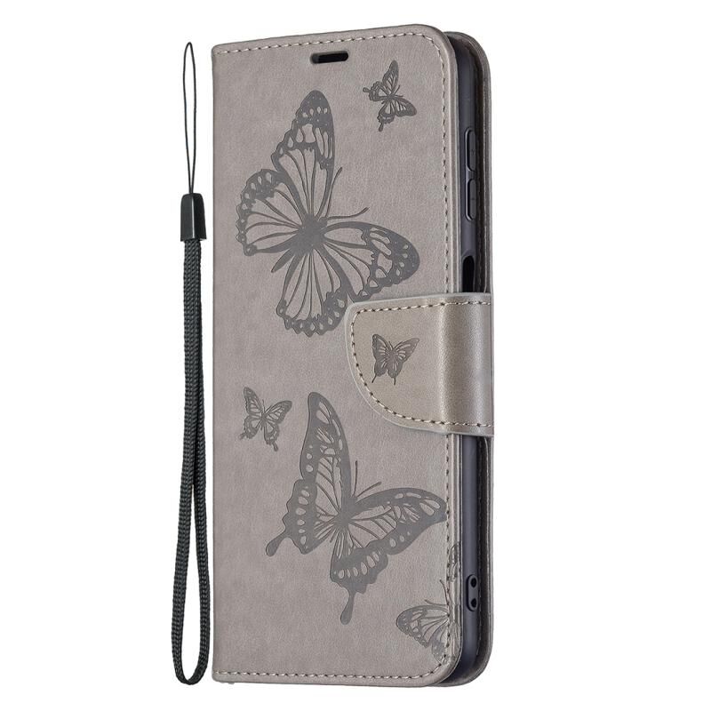 Για το Samsung Galaxy A22 4G ανάγλυφο δύο πεταλούδες μοτίβο οριζόντια Flip δέρμα τηλέφωνο υπόθεση με κάτοχο & υποδοχή για κάρτες & πορτοφόλι & Lanyard (γκρι)