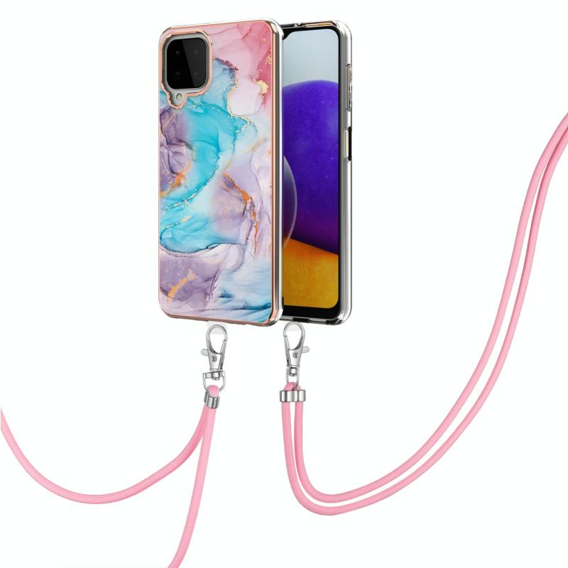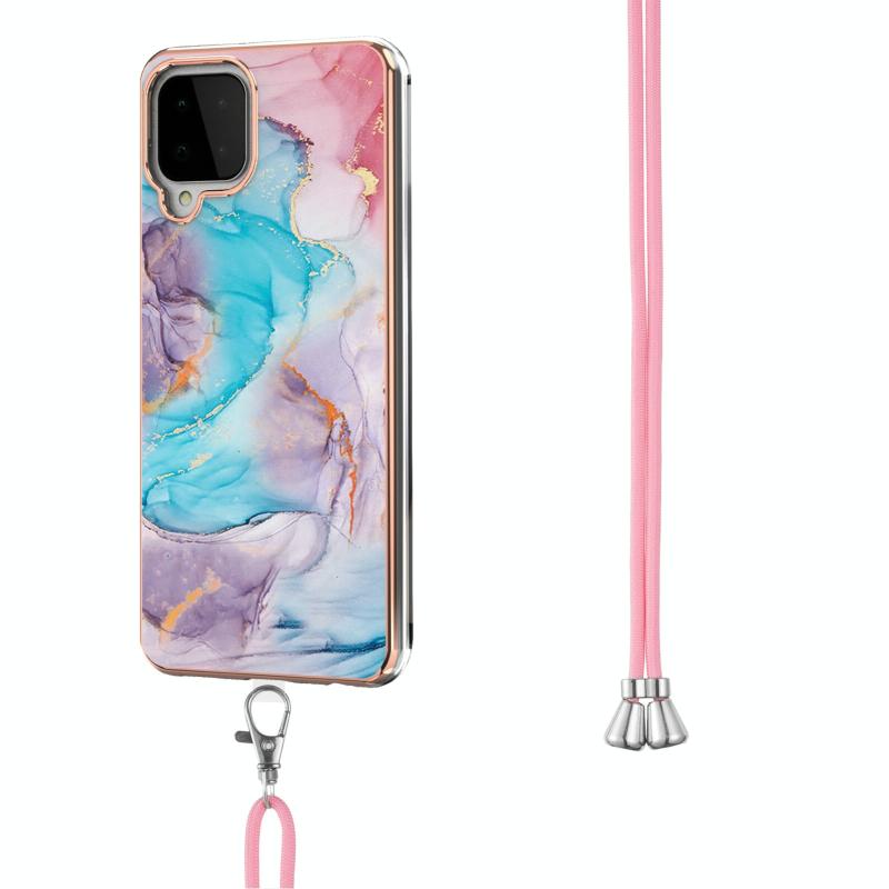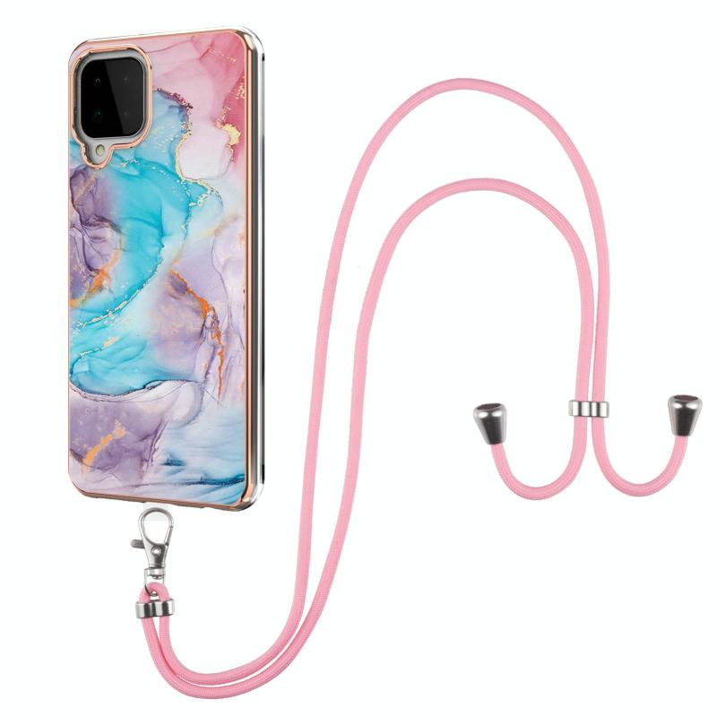 Θήκη προστασίας για Samsung Galaxy A22 4G EU Version/M32 με γαλβανισμένο σχέδιο IMD TPU, ανθεκτική σε κρούσεις, με κορδόνι λαιμού (Μωβ Λουλούδι)