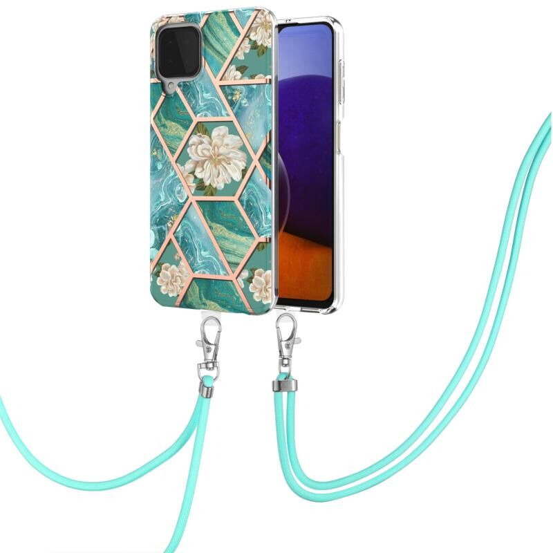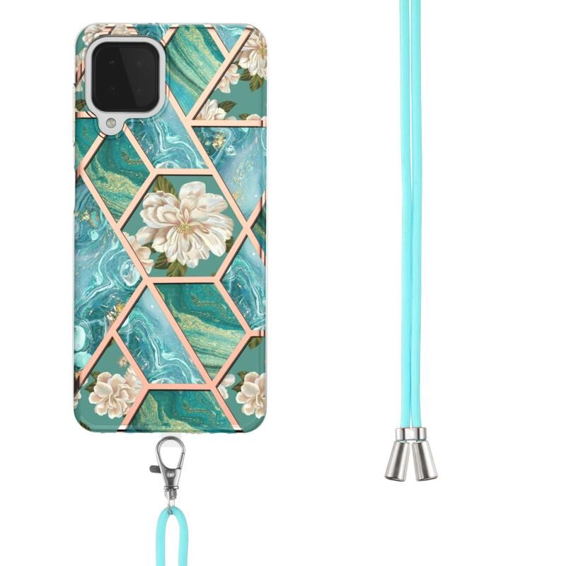 Θήκη για Samsung Galaxy A22 4G EU Version / M32 με ηλεκτρολυτική επιμετάλλωση, συνδυασμό μαρμάρου και λουλουδιών, από TPU με προστασία από κραδασμούς και λουρί (Ροζ Λουλούδι)