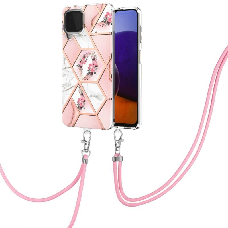 Θήκη για Samsung Galaxy A22 4G EU Version / M32 με ηλεκτρολυτική επιμετάλλωση, συνδυασμό μαρμάρου και λουλουδιών, από TPU με προστασία από κραδασμούς και λουρί (Ροζ Λουλούδι)