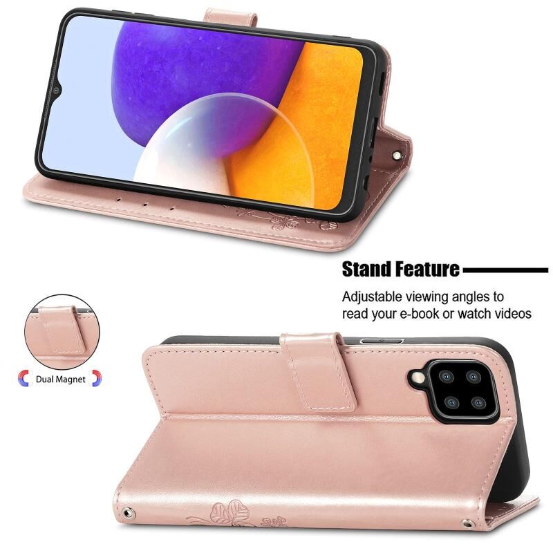 Για Samsung Galaxy A22 4G Four-leaf Clasp ανάγλυφο αγκράφα κινητό τηλέφωνο προστασία δερμάτινη θήκη με κορδόνι & υποδοχή για κάρτες & πορτοφόλι & βραχίονα λειτουργία (Rose Gold)