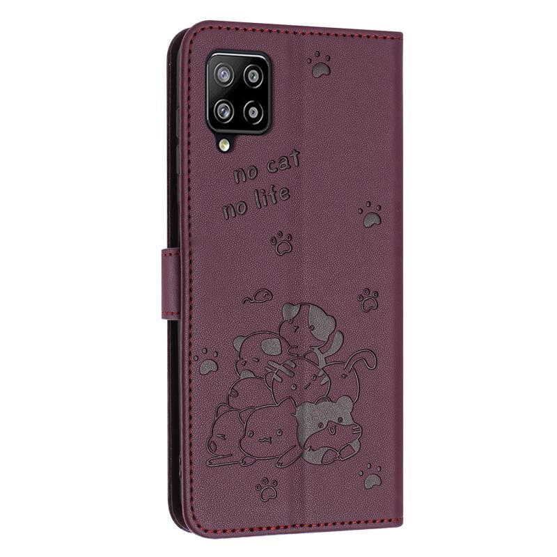 Θήκη δερμάτινη για Samsung Galaxy A22 4G / M32 4G με ανάγλυφο σχέδιο γατάκι και λουρί (Μωβ)