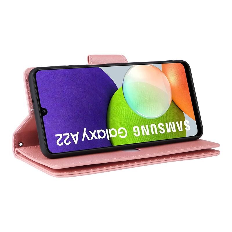 Για Samsung Galaxy A22 4G Rivet πόρπη 9 κάρτες τρεις φορές δερμάτινη θήκη τηλεφώνου (ροζ χρυσό)