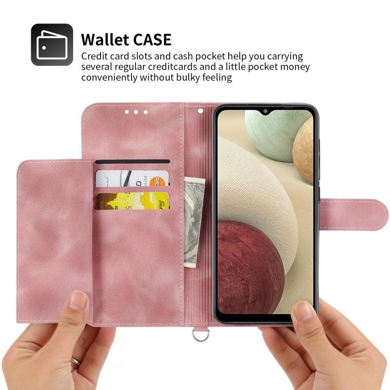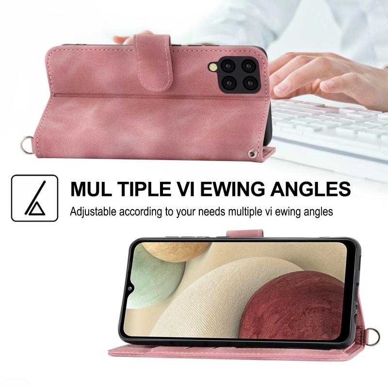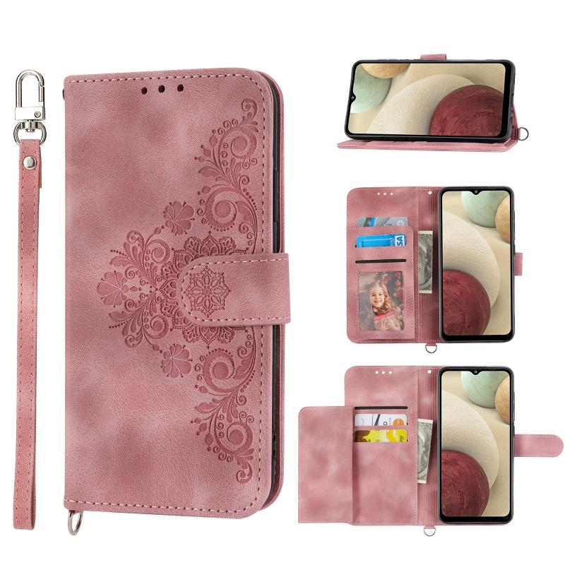 Θήκη τηλεφώνου Samsung Galaxy A22 4G με δερμάτινη υφή, ανάγλυφα λουλούδια και πορτοφόλι (ρόζ)