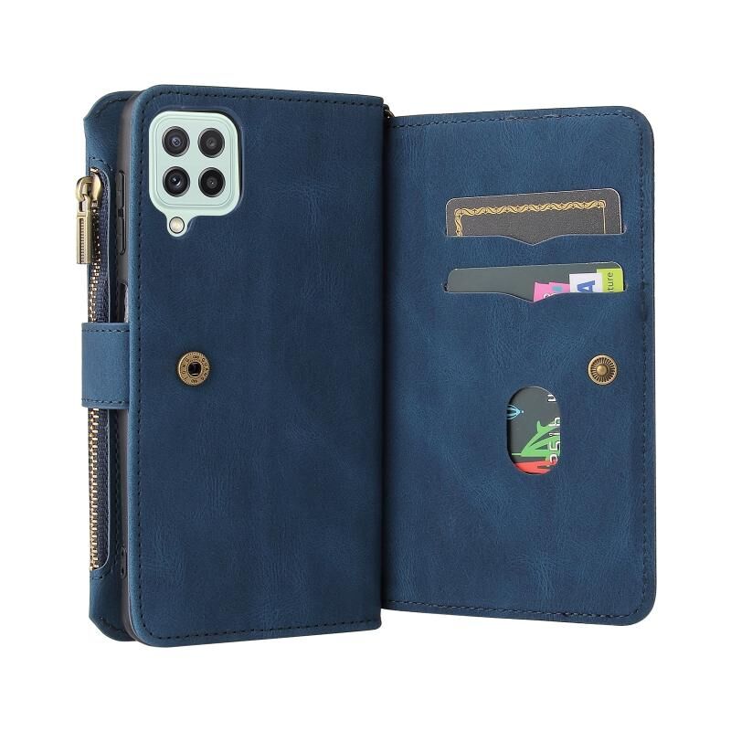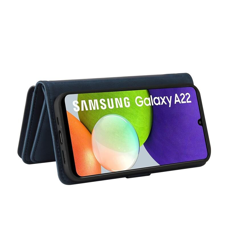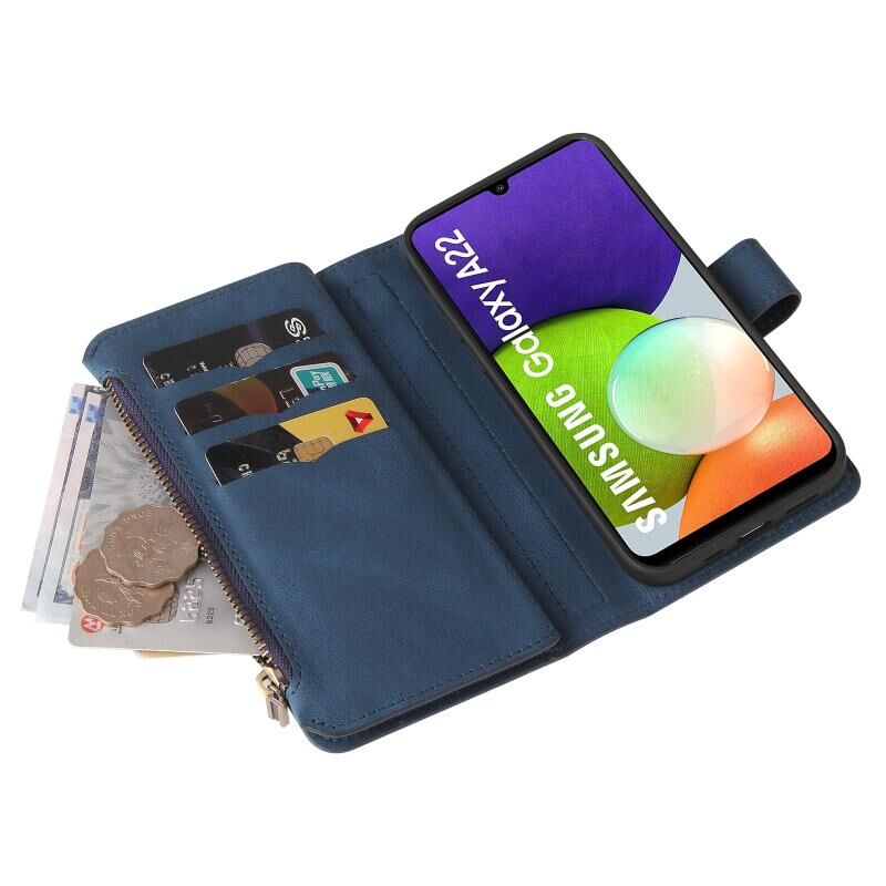 Για Samsung Galaxy A22 4G δέρμα αίσθηση PU + TPU οριζόντια Flip δερμάτινη θήκη με υποδοχή & 15 κάρτες Slot & πορτοφόλι & φερμουάρ τσέπη & Lanyard (Μπλε)