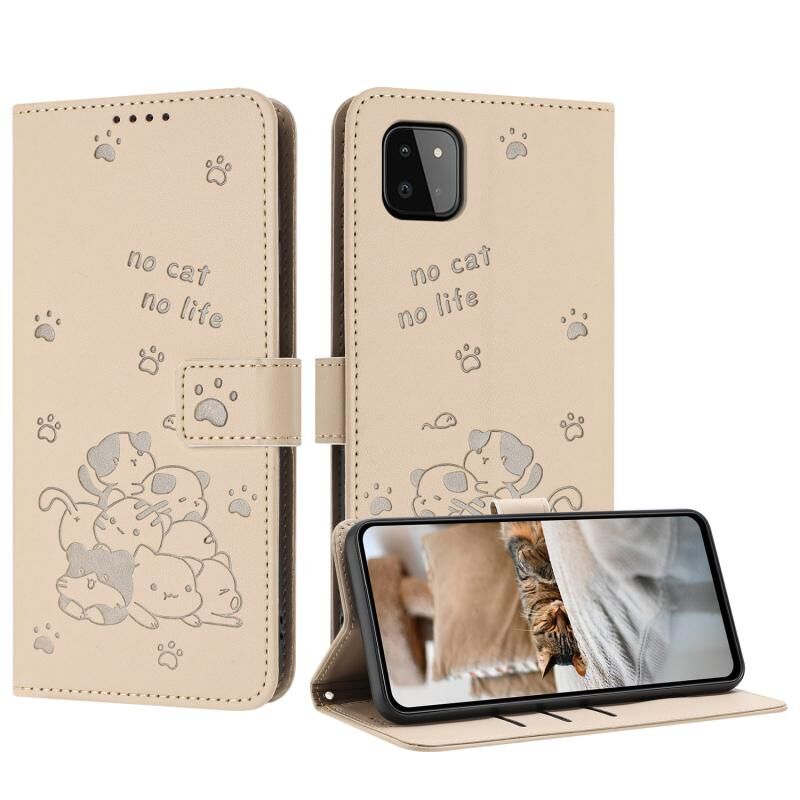 Θήκη δερμάτινη για Samsung Galaxy A22 5G / A22s 5G με ανάγλυφο σχέδιο γατάκι και λουρί (Μπεζ)