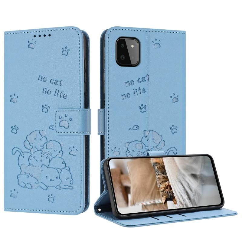 Θήκη δερμάτινη για Samsung Galaxy A22 5G / A22s 5G με ανάγλυφο σχέδιο γατάκι και κορδόνι (Μωβ)